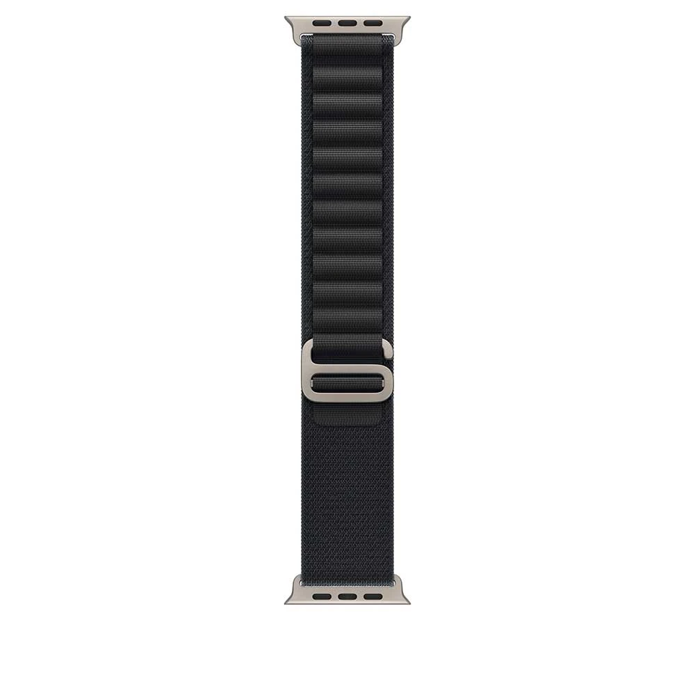 Řemínek Alpský tah k Apple Watch • pevné textilní vrstvy • titanová spona ve tvaru písmene G • spolehlivě drží • velikost pouzdra 49 mm • velikost řemínku Large (na zápěstí s obvodem 165-210 mm) • barva: černáá + kovové prvky z přírodního titanu