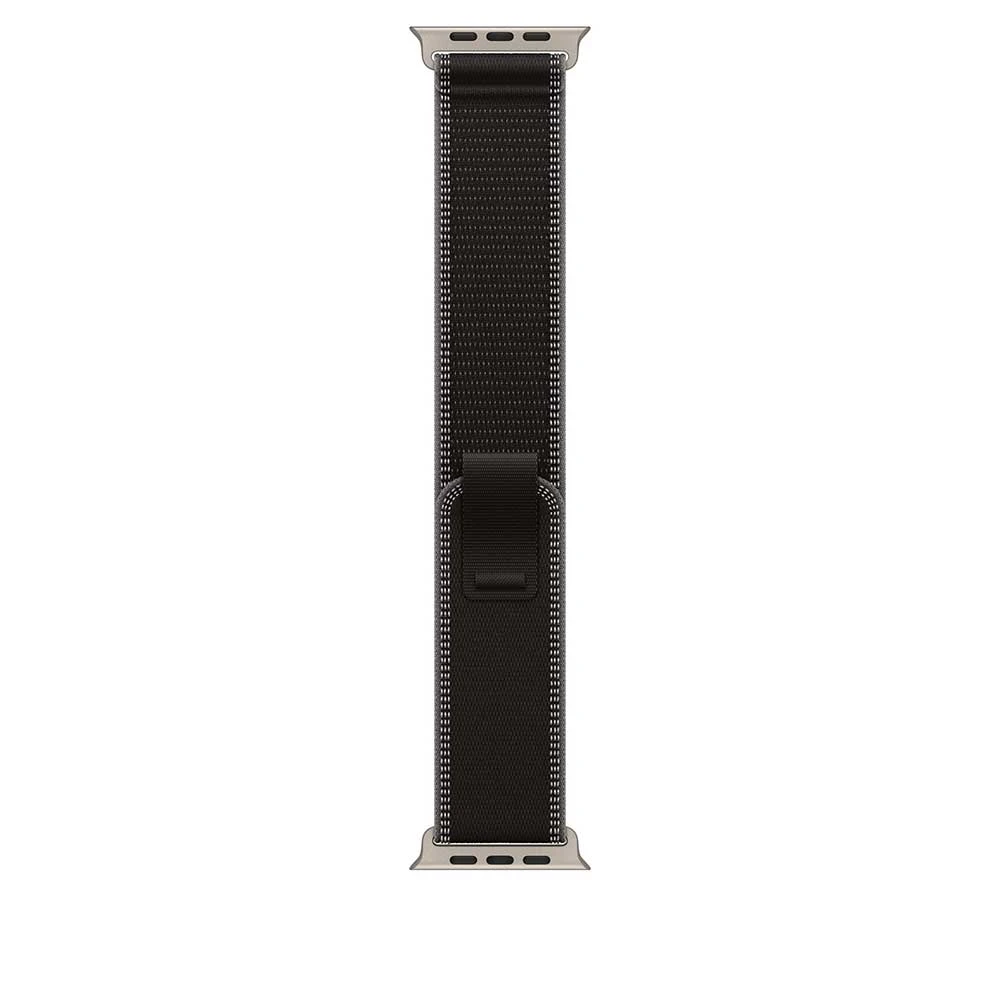 Řemínek Trailový tah k Apple Watch • ultratenký, lehký a strečový řemínek • nylonová tkanina • praktické zapínací poutko • reflexní vlákna po okrajích • velikost pouzdra 49 mm • • velikost řemínku M/L (na zápěstí s obvodem 145 -220 mm) • barva: černá/uhlová + kovové prvky v přírodním titanu
