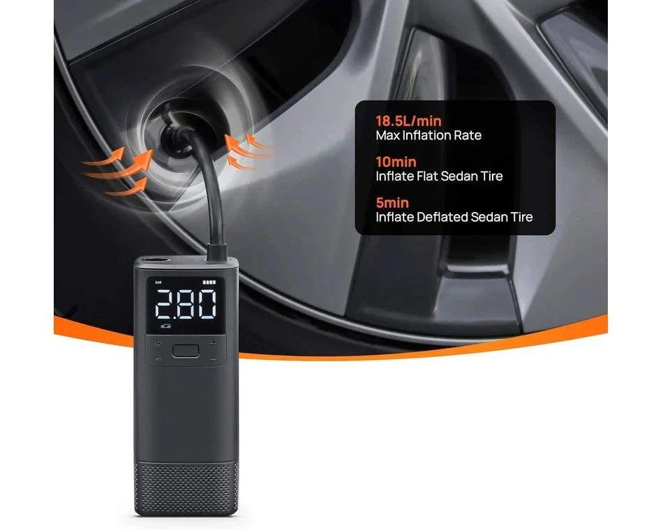 Přenosný kompresor 70mai • napájení 12 V přes zásuvku autozapalovače • max. tlak až 7 atmosfér (100 PSI) • výkon 39 l/min • LCD dotykový displej • dlouhý kabel pro lepší dosah 3,7 m • tichý provoz kolem 72 dB • váha 2,35 kg • barva: černá