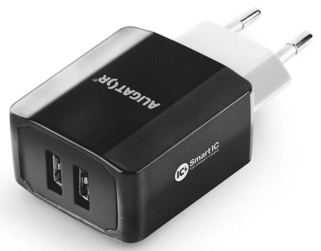 Chytrá síťová nabíječka ALIGATOR 3.4A, 2xUSB, smart IC. Nová výkonná síťová nabíječka řady „SMART IC“ v černém provedení, dvěma USB porty s výstupní kapacitou 3.4A. Až 5x rychlejší nabíjení oproti běžné USB nabíječce.