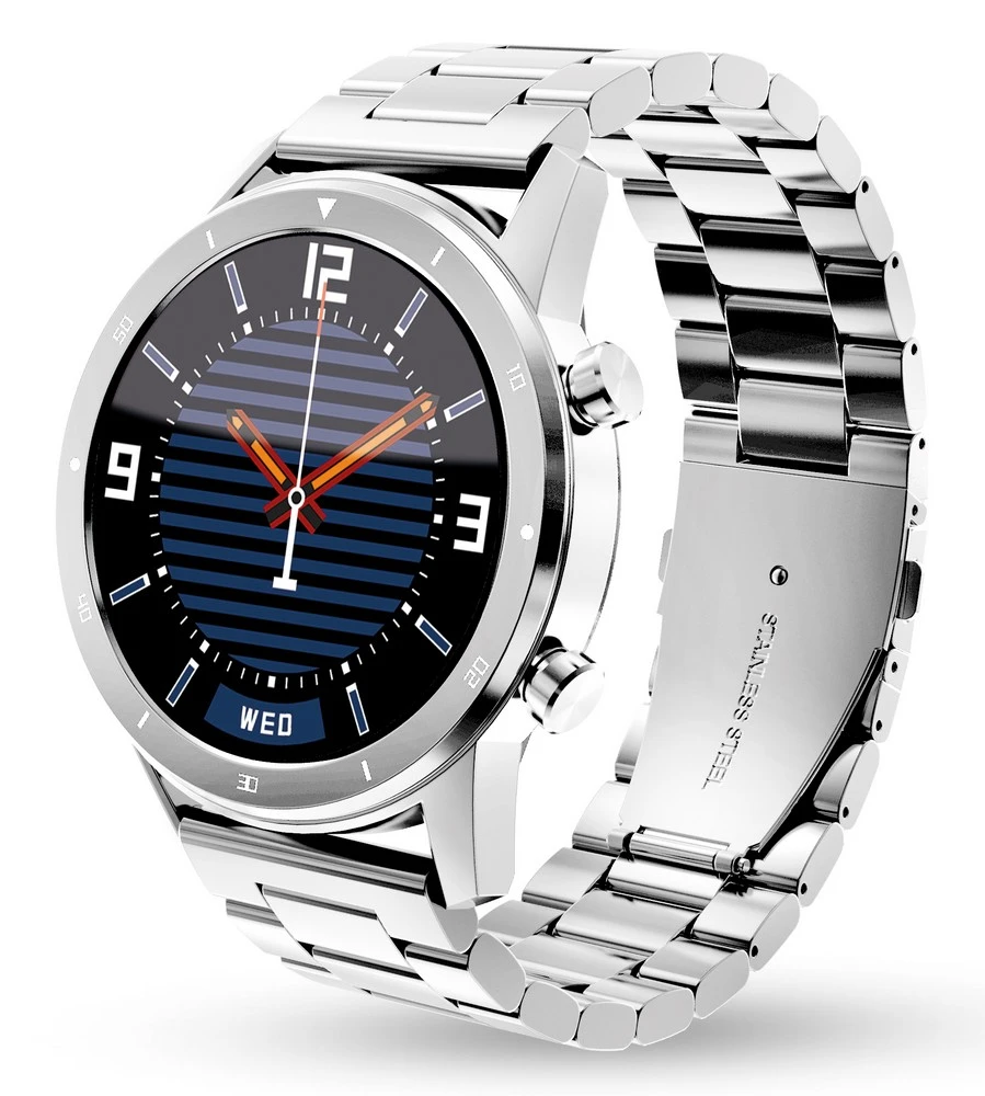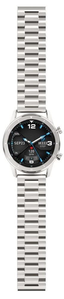 Kulatý 1,3"dotykový displej,IPS,240x240;2xboční tlačítko,IP67/68;baterie 200mAh,výdrž až 10dní;BT 5.0;USB kabel s magnet.uchytem; vibrace;vyměnitelný řemínek.
