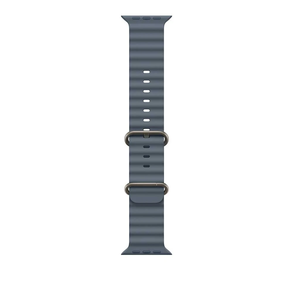 Oceánský řemínek k Apple Watch • pružný řemínek • titanová přezka • prvky odolné proti korozi • velikost pouzdra 49 mm • barva: ocelově modrá s kovovými prvky z přírodního titanu