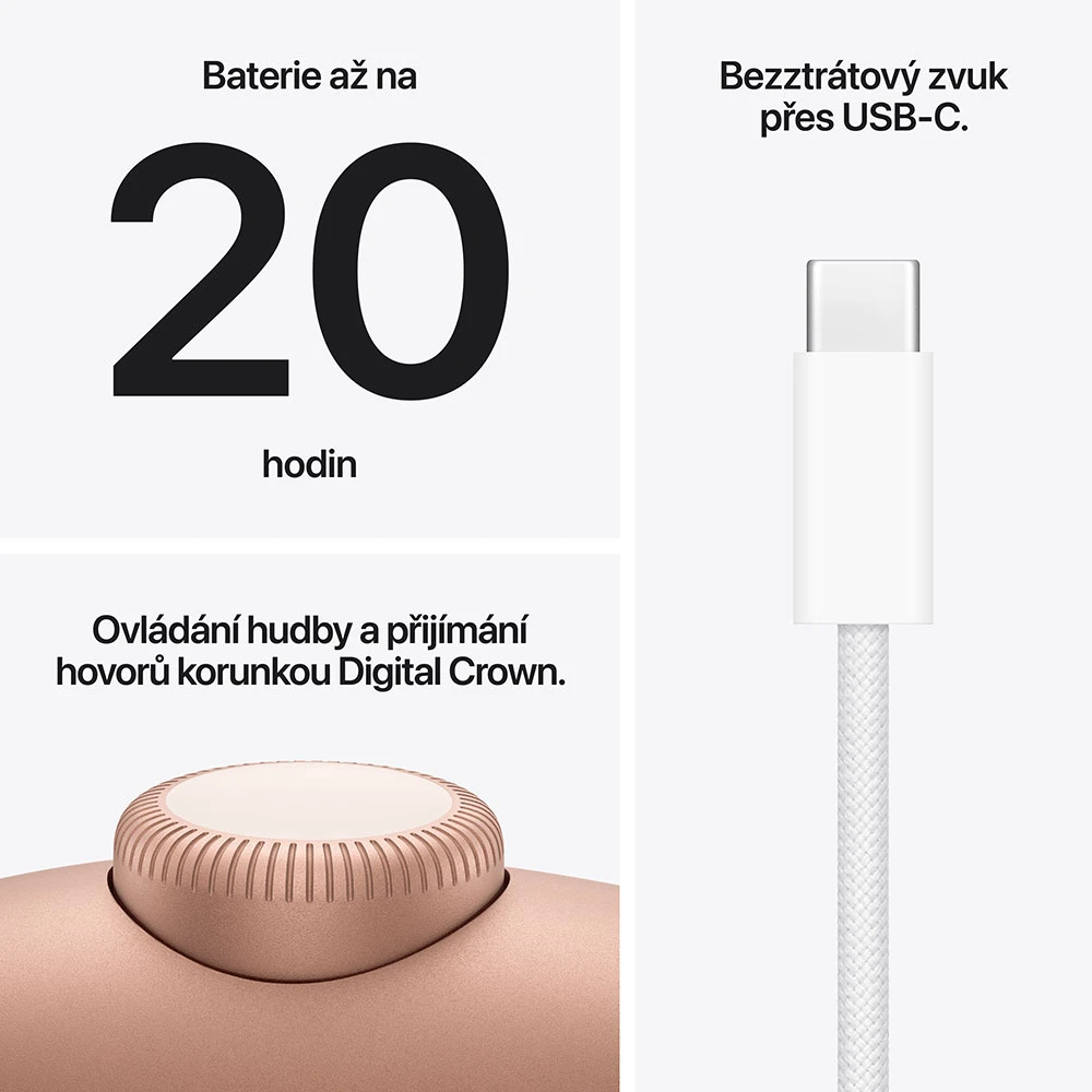 • High-endová bezdrátová sluchátka přes hlavu • Špičkové aktivní potlačení hluku (ANC) nová generace nabízí výrazně účinnější izolaci okolního hluku pro nerušený poslech. • Nový čip Apple H2 zajišťuje vyšší výkon, lepší zpracování zvuku a pokročilé chytré funkce. • Ještě kvalitnější zvuk optimalizované audio ladění přináší detailnější basy, čisté výšky a věrnější podání hudby. • Lossless audio přes USB-C možnost poslechu ve vysokém rozlišení (24-bit / 48 kHz) při kabelovém připojení.