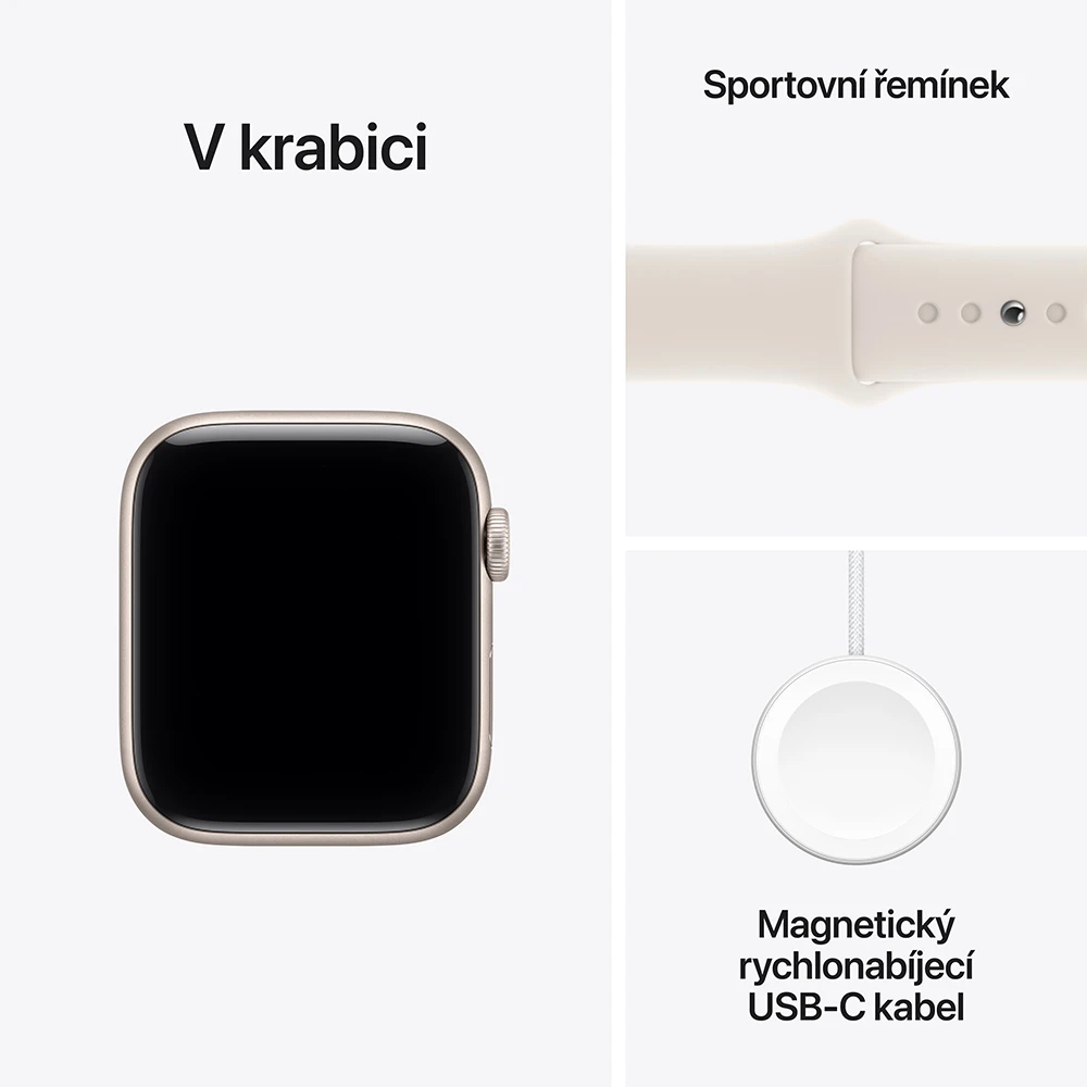 • Apple Watch SE • Řemínek • Magnetická rychlonabíječka Apple Watch s USB‑C kabelem (1m) •