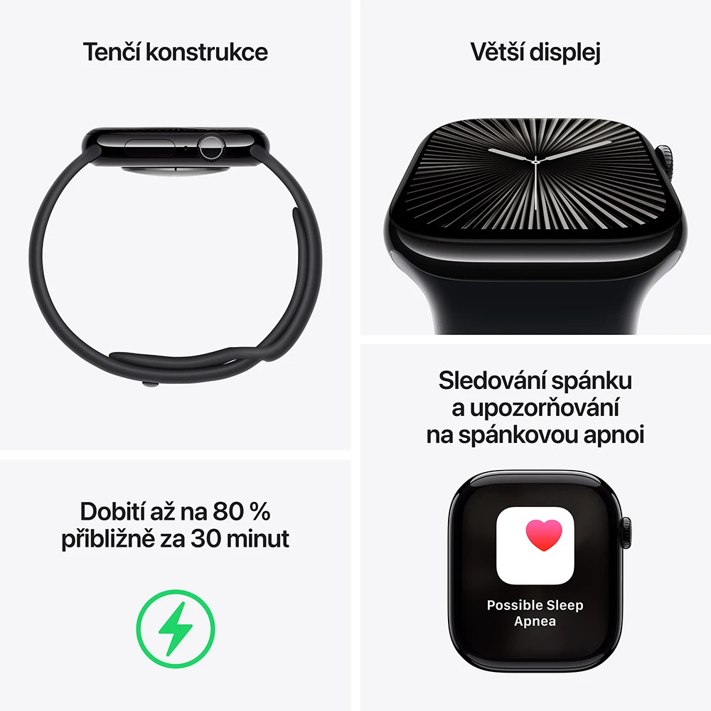 Apple Watch Series 10 • stále zapnutý LTPO3 OLED Retina displej (až 2 000 nitů) • čip SiP S10 • 46mm pouzdro z hliníku • sportovní a fitness režimy • EKG • saturace krve kyslíkem • snímání tepové frekvence i teploty • monitorování srdečního rytmu, kardiovaskulární kondice i spánku • sledování duševního stavu i cyklu se zpětným odhadem doby ovulace • detekce pádu a autonehody • reproduktor • boční tlačítko • Apple Pay • GPS • Wi-Fi • Bluetooth 5.3 • voděodolnost • výdrž až 36 h • watchOS 1