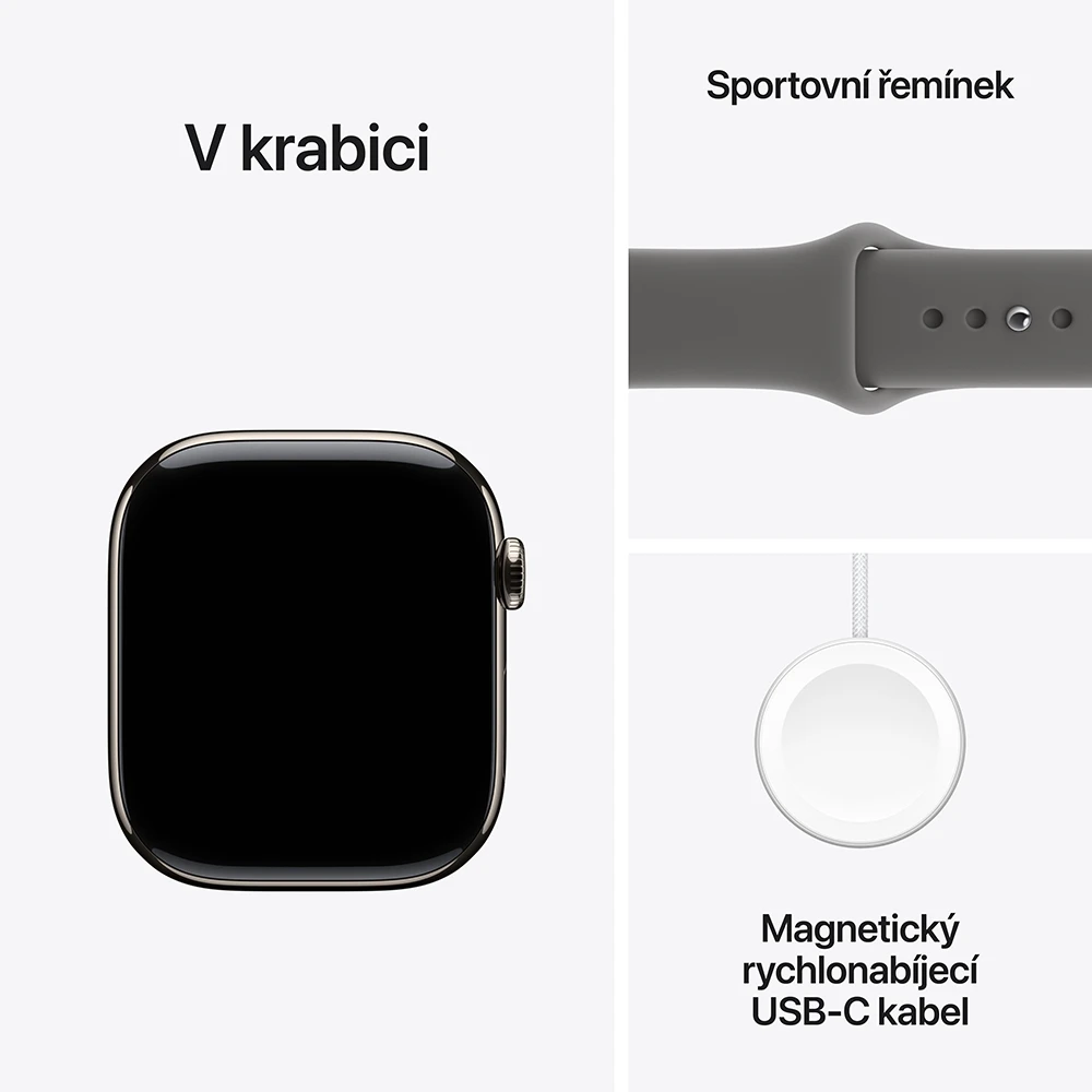 Apple Watch Series 11 • stále zapnutý LTPO3 OLED Retina displej (až 2 000 nitů) • čip Apple S10 • 42mm pouzdro z titanu • sportovní a fitness režimy • EKG • sat. krve kyslíkem • snímání tepové frekv. i teploty • mon. srdečního rytmu, kardiovaskulární kondice i spánku • sledování duševního stavu i cyklu se zpětným odhadem doby ovulace • detekce pádu a autonehody • reproduktor • boční tlačítko • Apple Pay • GPS • SOS tíseň • 5G • Wi-Fi • BT 5.3 • voděodolnost • IP6X • výdrž až 38 h • watchOS 26