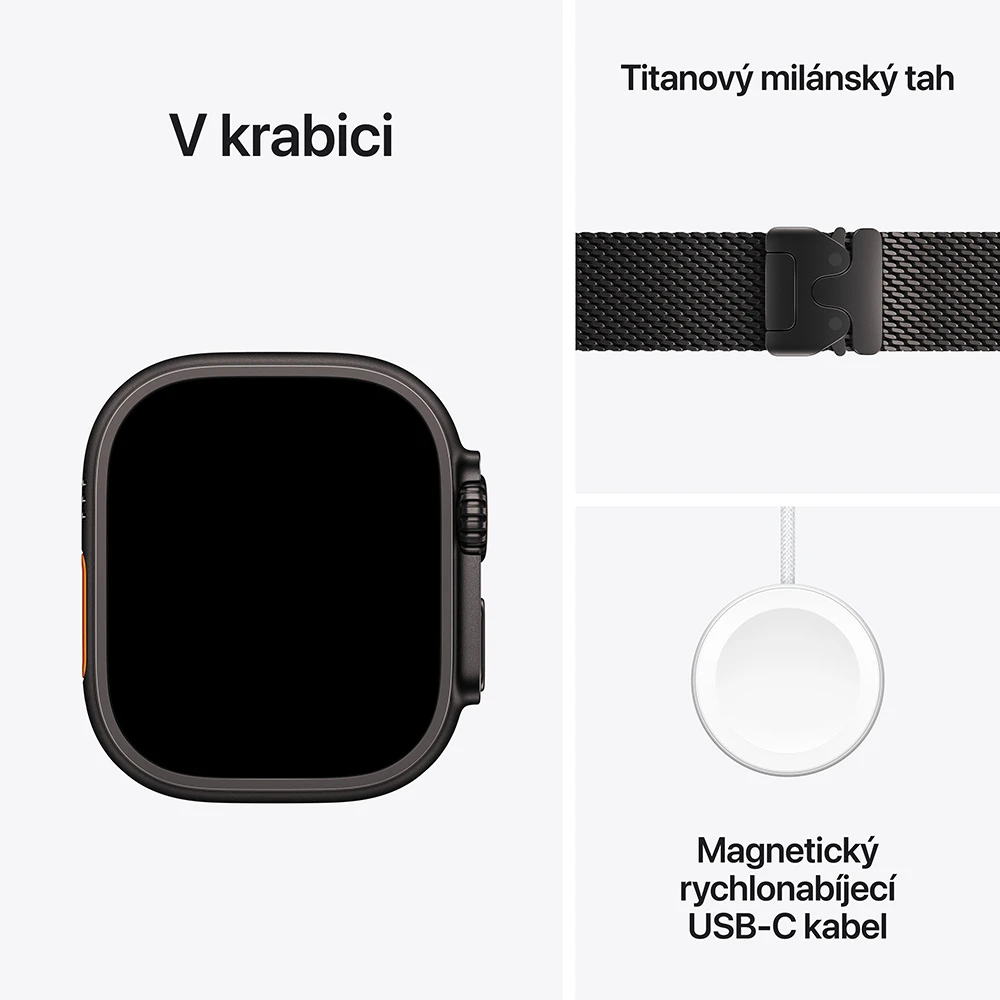 • Apple Watch Ultra 3 • Řemínek • Magnetická rychlonabíječka Apple Watch s USB‑C kabelem (1m) •