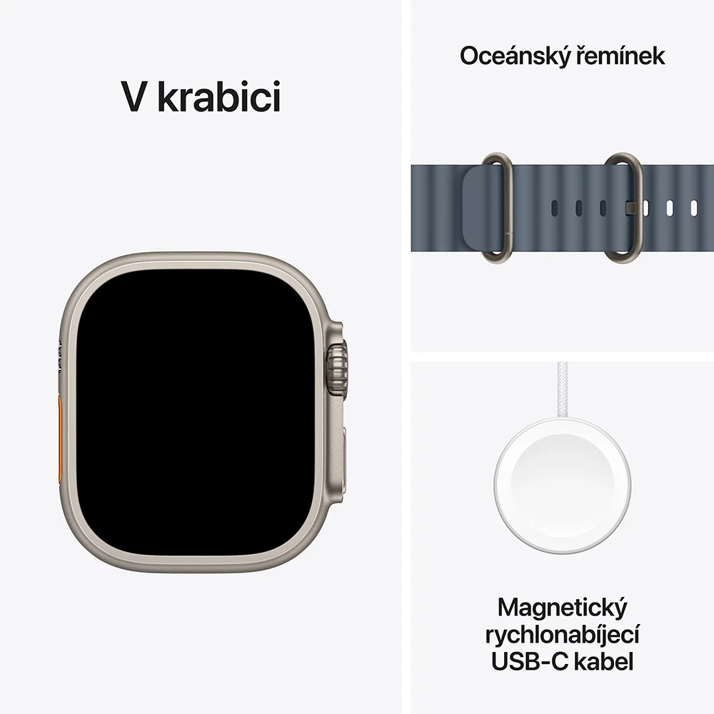 • Apple Watch Ultra 3 • Řemínek • Magnetická rychlonabíječka Apple Watch s USB‑C kabelem (1m) •
