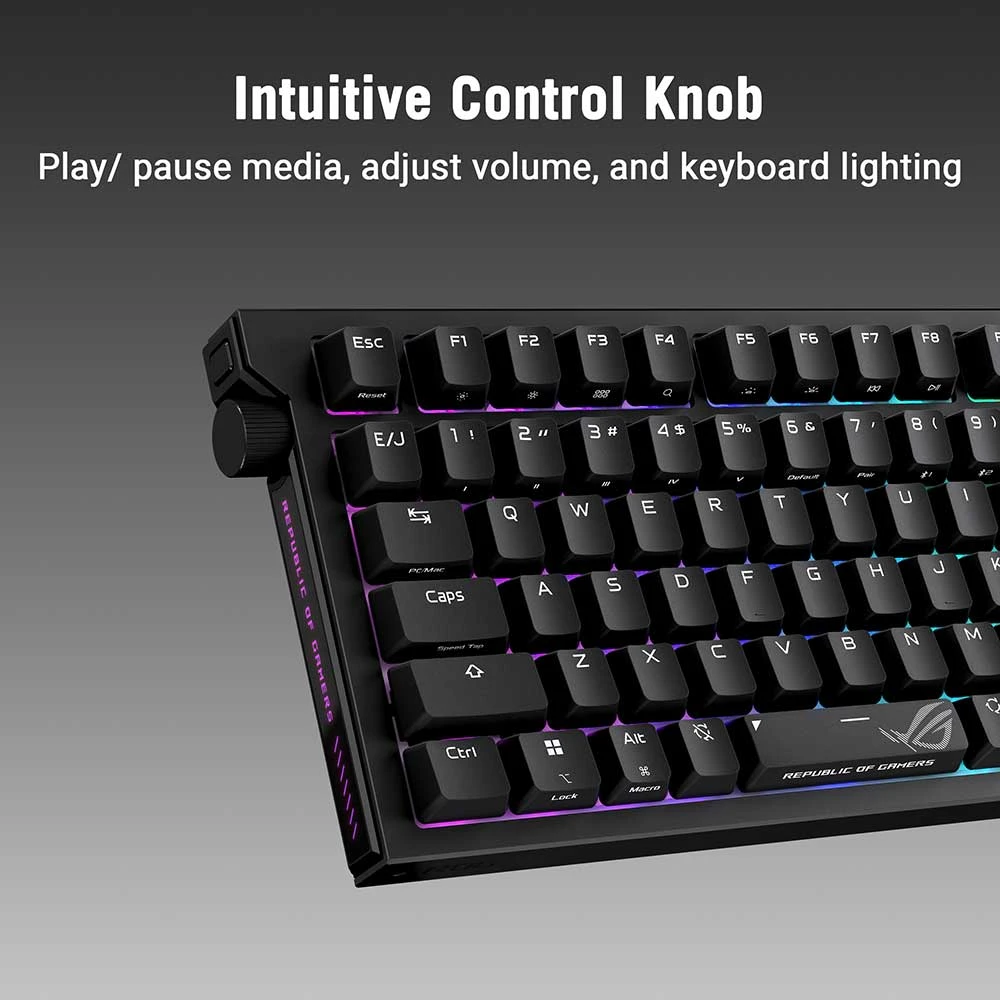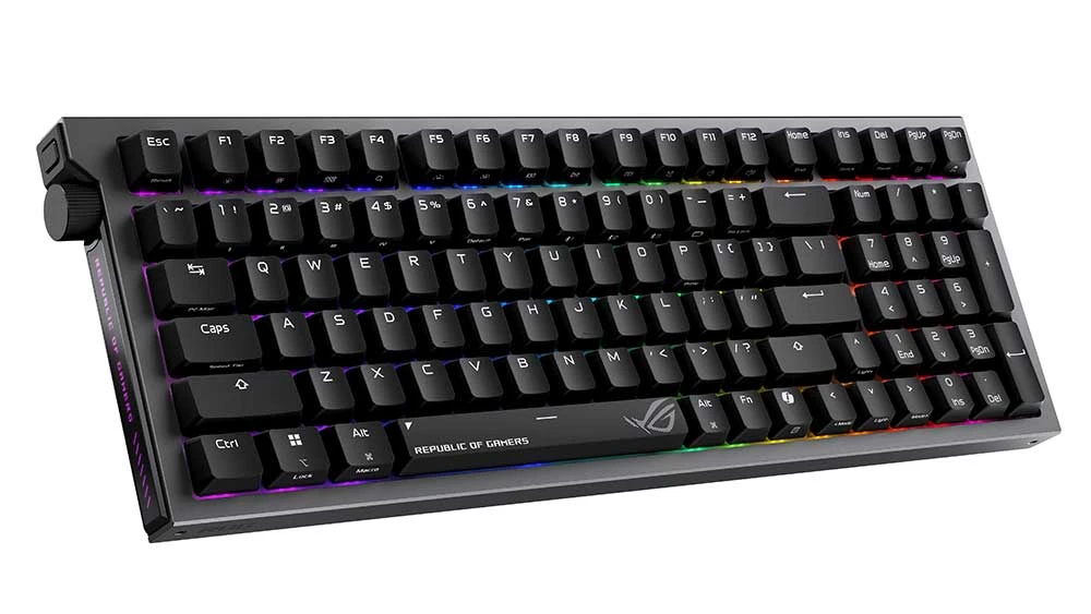 Herní klávesnice ASUS ROG Strix Morph 96 WL • formát 96% • Hot-swap magnetické spínače ROG NX Snow • ROG SpeedNova 8K bezdrátová technologie – ultrarychlé připojení s polling rate až 8 000 Hz • tři režimy připojení – 2,4 GHz RF, Bluetooth® nebo USB připojení • integrovaný třísměrný ovládací knoflík • šestivrstvé tlumení • kovový horní kryt