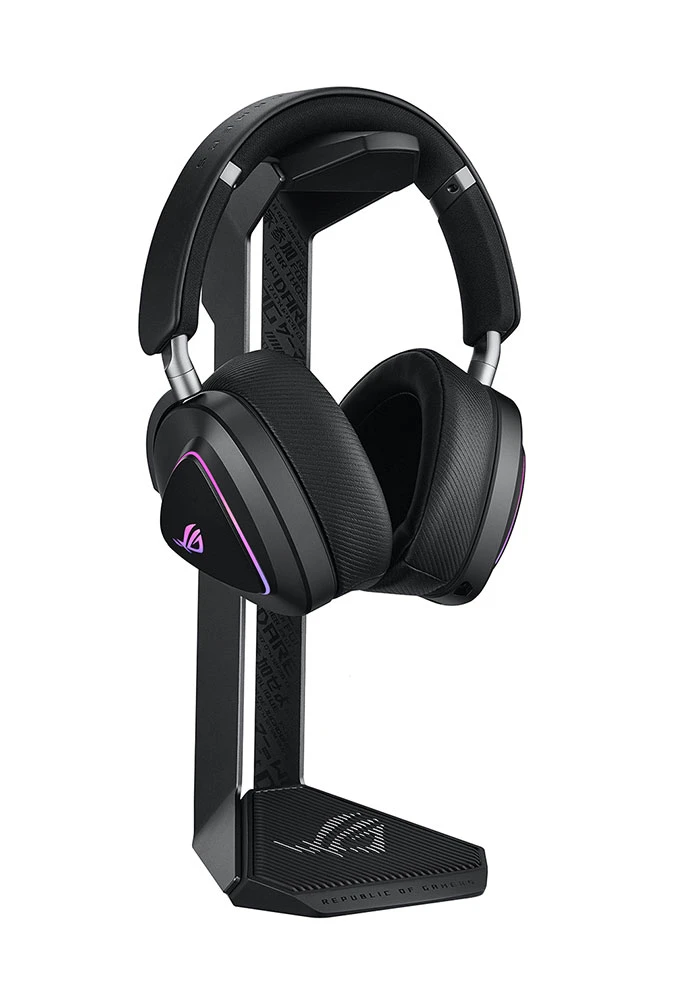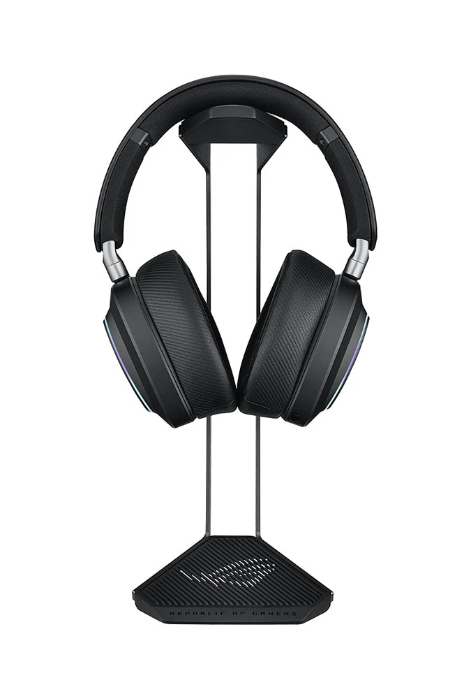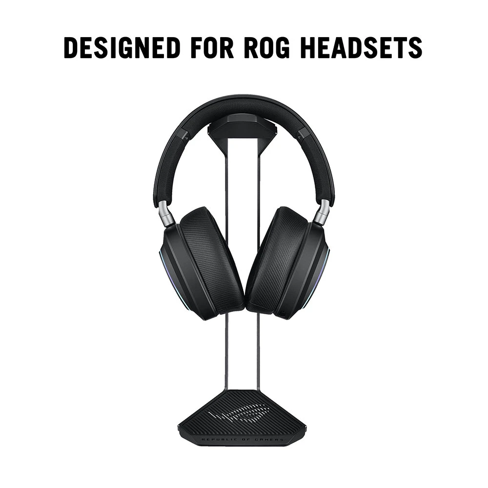 Stojan na náhlavní sluchátka • navržen pro ROG headsety • prémiová ROG estetika • konstrukce z hliníkové slitiny • protiskluzová základna • stabilní a bezpečné uložení • stříbrné logo ROG (silver-foil)