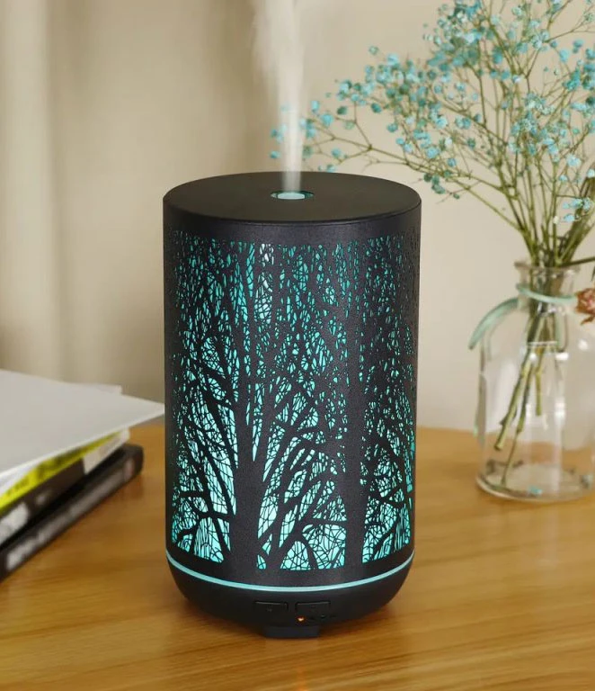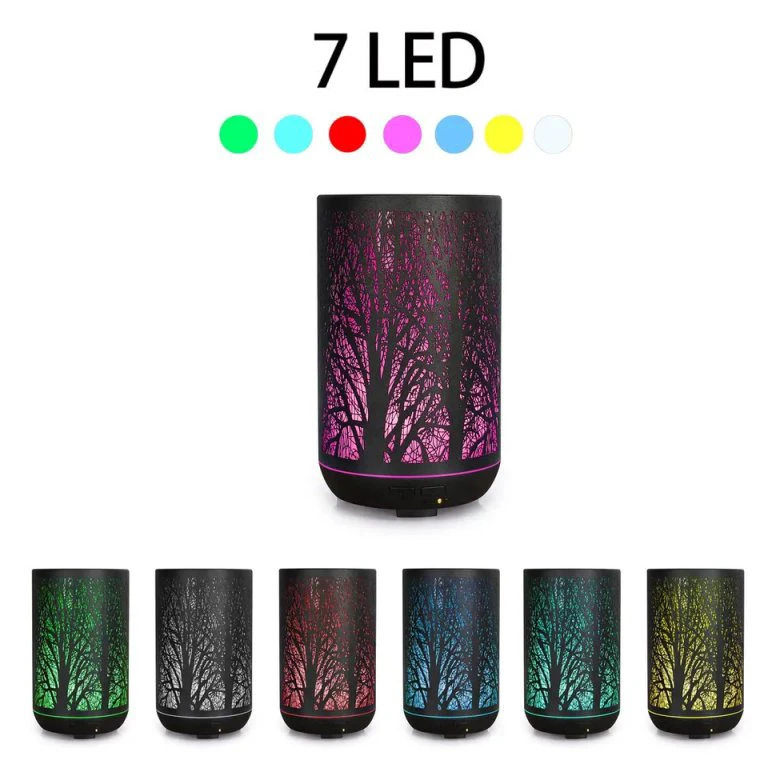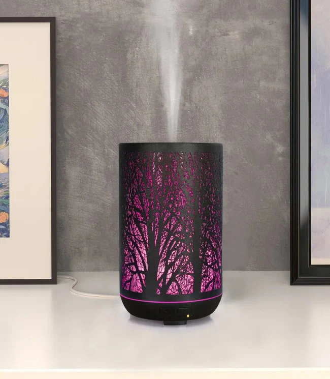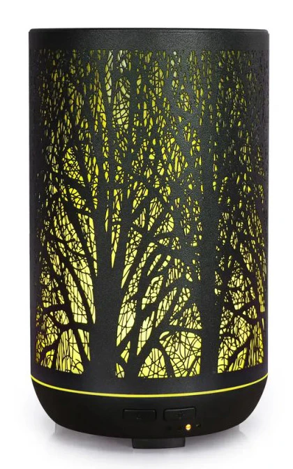 Tlačítky ovládaný aroma difuzér • technologie ultrazvukové difúze • objem nádoby 300 ml • 7 barev podsvícení • nastavitelný výstup mlhy • 3 různé časovače • doba provozu 12 hodin • tichý provoz • materiál kov • motiv stromy • barva: černá