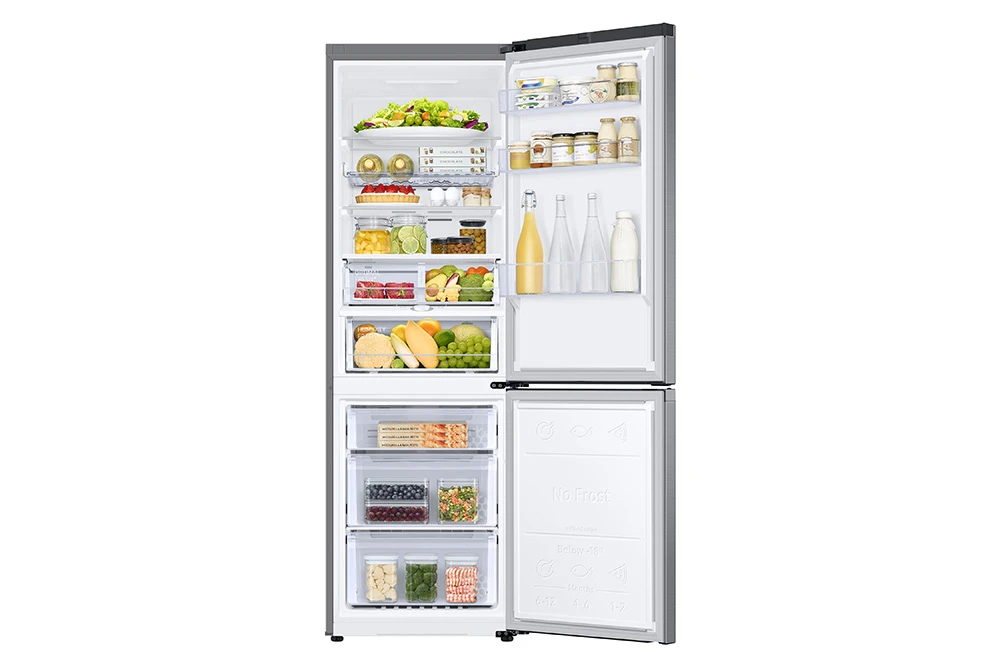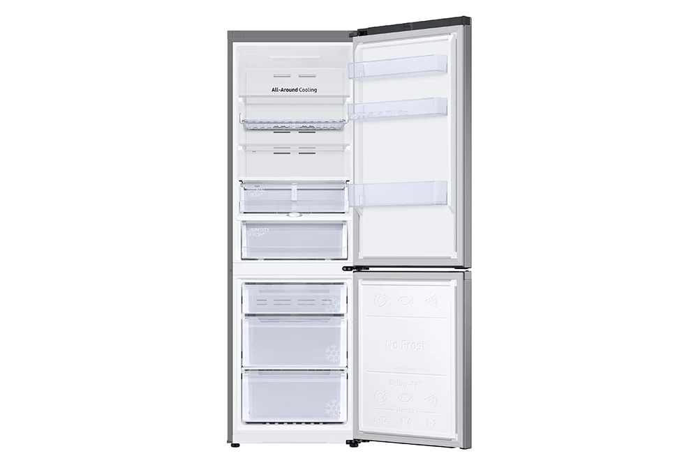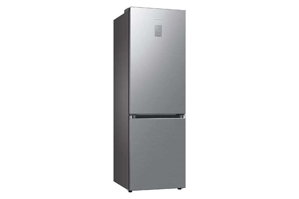 Kombinovaná chladnička • energetická třída D • kapacita 344 l (230 / 114) • All Around Cooling • technologie No Frost • rozložení: 4 police chladničky, 3 zásuvky mrazničky, držák na víno • externí displej • spotřeba 204 kWh/ročně • hlučnost 35 dBA • mrazící výkon 8 kg/24h • alarm • WiFi • SMART funkce • výška 185 cm • barva stříbrná