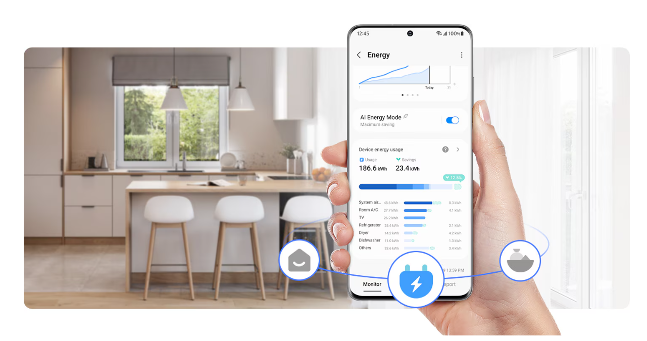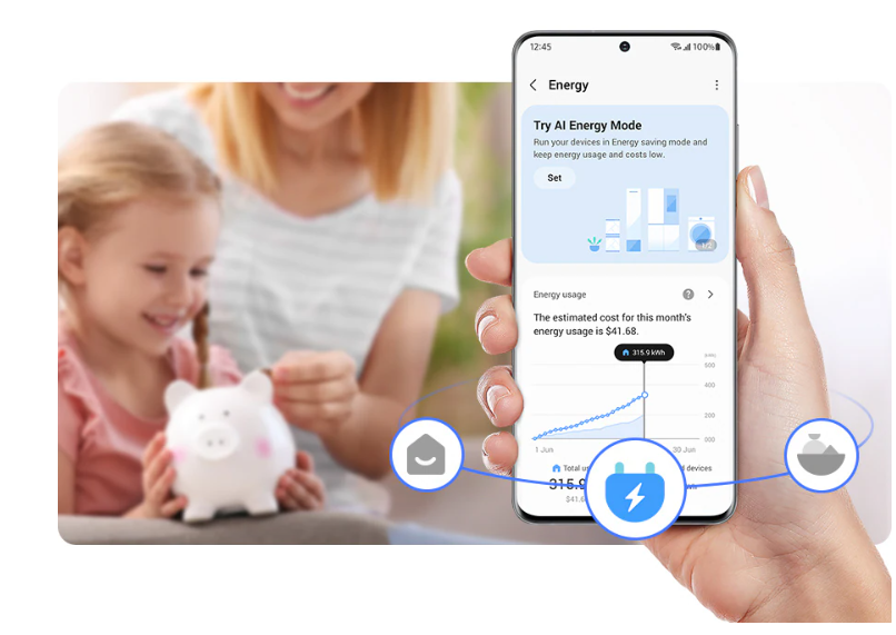 Upravte si spotřebu elektrické energie, snižte osobní uhlíkovou stopu a šetřete peníze. Platforma SmartThings Energy vám poskyne rady ohledně snížení spotřeby, sleduje množství energie spotřebovávané jednotlivými zařízeními a porovnává ji s předchozím obdobím.