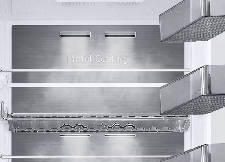 Systém All-around Cooling chladí každou přihrádku rovnoměrně od rohu k rohu. Neustále kontroluje teplotu a cirkuluje chladný vzduch strategicky umístěnými větracími otvory. Kovová chladící deska Metal Cooling zadržuje chladný vzduch a pomáhá obnovit případné tepelné ztráty. Navíc dodává zařízení prémiový vzhled a snadno se čistí. Technologie No Frost zvyšuje cirkulaci vzduchu tak, aby udržovala konstantní teplotu, čímž zabraňuje hromadění ledu. Rovněž dosáhne cílové teploty mnohem rychleji a klade menší nároky na chladicí systém.