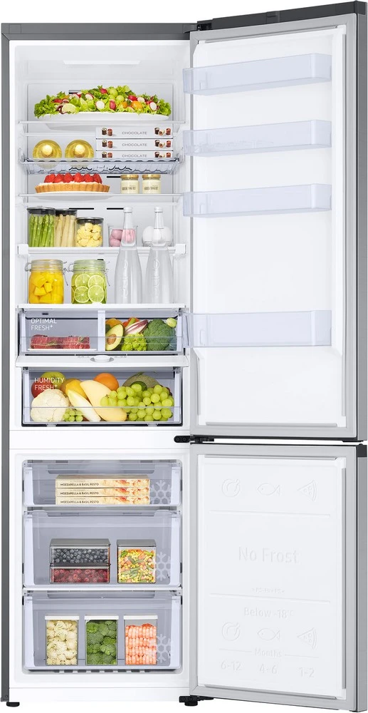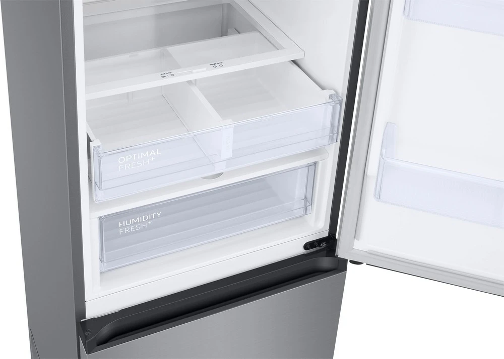 Uspořádání interiéru chladničky Samsung RB38C676CSA/EF sestává ze 4 přihrádek ve dveřích (z toho 1 hluboké), 4 skleněných polic (z toho 1 skládací), 2 zásuvek na čerstvé potraviny, police na víno a z přihrádky na vajíčka. Přehled nad všemi potravinami v lednici zajišťuje příjemné a úsporné LED osvětlení. V mrazáku naleznete 3 zásuvky a praktický výrobník ledu. Zásuvky na čerstvé potraviny v ledničce jsou tvořeny jedinečnými zónami Optimal a Humidity. Optimal Fresh+ nabízí možnost rozdělení na 2 samostatné zóny s vlastními teplotami (lze samozřejmě používat i jako jednotnou zónu), přičemž levá bude vždy chladnější. Levá zásuvka tak prodlouží čerstvost vašeho masa a ryb minimálně dvojnásobně, tu pravou oceníte pro uzamknutí živin a čerstvosti v ovoci a zelenině. Box Humidity Fresh+ je zase nenahraditelný pro uchovávání specifických vlastností potravin (vůně, textura a chutě) u kousků, jež mají tendenci se rychleji kazit. Pohodlně můžete nastavit optimální vlhkost a získat to nejlepší prostředí pro maximální čerstvost, křehkost a šťavnatost.