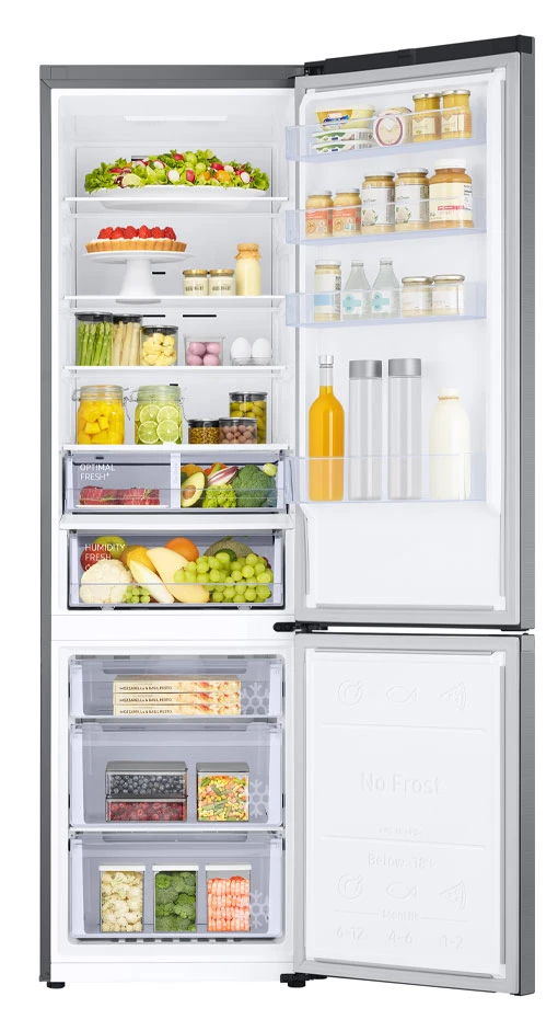 Uspořádání interiéru chladničky Samsung RB38T607BS9/EF sestává ze 4 přihrádek ve dveřích (z toho 1 hluboké), 4 skleněných polic, 2 zásuvek na čerstvé potraviny a ze zásobníku na vajíčka. Přehled nad všemi potravinami v lednici zajišťuje příjemné a úsporné LED osvětlení. V mrazáku naleznete 3 boxy a praktický výrobník ledu. Zásuvky na čerstvé potraviny v ledničce jsou tvořeny jedinečnými zónami Optimal a Humidity. Optimal Fresh+ nabízí možnost rozdělení na 2 samostatné zóny s vlastními teplotami (lze samozřejmě používat i jako jednotnou zónu), přičemž levá bude vždy chladnější. Levá zásuvka tak prodlouží čerstvost vašeho masa a ryb minimálně dvojnásobně, tu pravou oceníte pro uzamknutí živin a čerstvosti v ovoci a zelenině. Box Humidity Fresh je zase nenahraditelný pro uchovávání specifických vlastností potravin (vůně, textura a chutě) u kousků, jež mají tendenci se rychleji kazit.