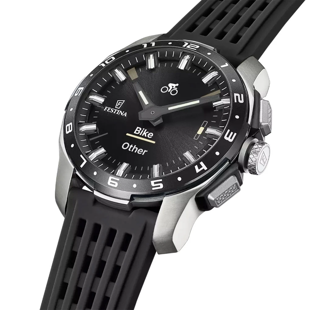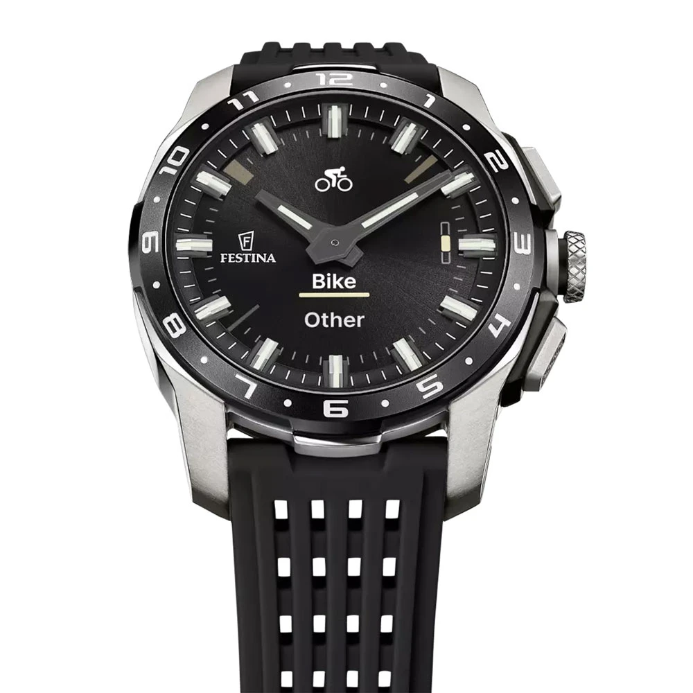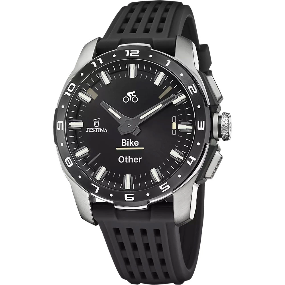 Hybridní chytré hodinky (klasický vzhled + smart funkce) • titanové, lehké a odolné pouzdro • průměr 44 mm • silikonový řemínek s trnovou sponou • kombinovaný černý číselník s luminiscenčními ručkami • safírové sklíčko • vodotěsnost do 5 ATM • měření tepu • spálené kalorie • VO2max • monitoring spánku • krokoměr • až 10 dní na jedno nabití • Bluetooth • jednoduché ovládání pomocí tlačítek • aplikace Festina Connected • barva: černá