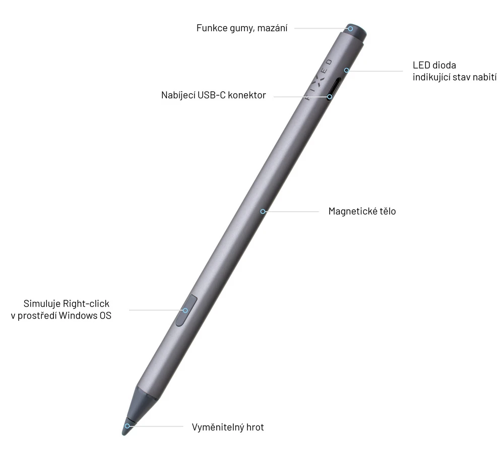 dotykové pero FIXED Graphite, 1 náhradní hrot, nabíjecí USB-C kabel