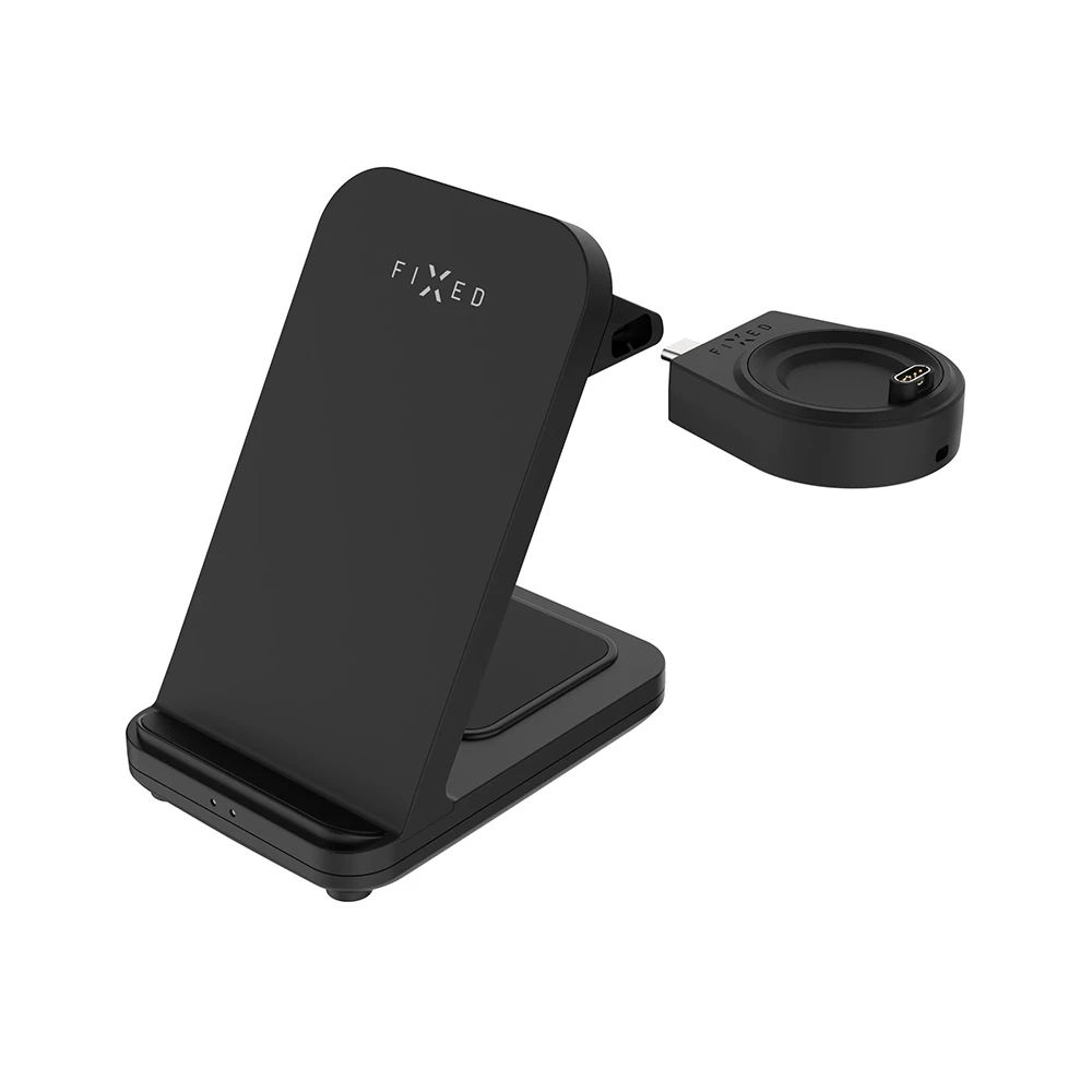 Bezdrátový stojánek FIXED Powerstation pro Garmin nabízí pohodlné nabíjení až tři zařízení zároveň • Hlavní plocha podporuje rychlé nabíjení telefonů díky výkonu až 15 W a kombinované sítě je možné umístit jak v horizontální, tak vertikální pozici • Druhá plocha s výkonem až 5 W • Součástí stojanu je odnímatelný adaptér pro chytré hodinky Garmin, navržený ve vlastním designu značky FIXED • Otočný vnitřní kroužek s pinem