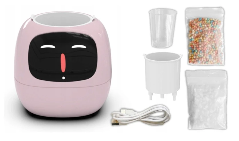 Chytrý květináč, Dekorativní prvky (drobné kamínky + barevné keramické granule), odměrka, nabíjecí kabel USB typu C, Uživatelská příručka