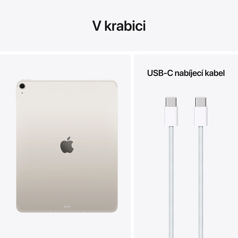 iPad Air 13" 2026 • 13" Liquid Retina displej s LED podsvícením (2 732 × 2 048 px, 600 nitů, True Tone, antireflexní) • čip Apple M4 – 8jádrové CPU, 9jádrové GPU & 16jádrový Neural Engine • 12GB RAM • 256GB úložiště • zadní 12MPx širokoúhlý fotoaparát (f/1,8) • přední 12MPx ultraširokoúhlá kamera (f/2,0) • stereo reproduktory • 2 mikrofony • Touch ID • 5G/LTE • Wi‑Fi 7 • Bluetooth 6.0 • GPS • USB‑C konektor • až 9 h sledování videí na jedno nabití • eSIM • iPadOS 26 • barva: béžová