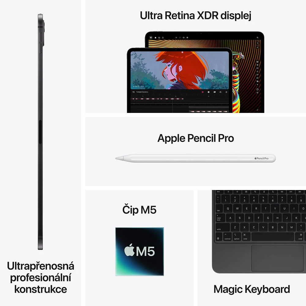 iPad Pro 2025 • 13" Ultra Retina XDR displej (Tandem OLED, 2 752×2 064 px, ProMotion 10-120 Hz, P3, True Tone, až 1600 nitů, antireflexní s nanotexturou) • čip Apple M5 – 10jádr. CPU, 10jádr. GPU & 16jádr. Neural Engine • 16GB RAM • 2TB úložiště • zadní 12MPx širokoúhlý fotoap. (f/1,8) • přední 12MPx Center Stage kamera (f/2,0) • 4 repro. • 4 mikro. • Face ID • LiDAR • 5G/LTE (eSIM) • Wi‑Fi 7 • BT 6.0 • Thunderbolt/USB 4 • až 10 h sledování videí na jedno nab. • iPadOS 26 • vesmírně černá