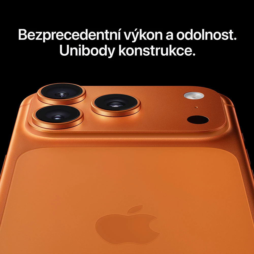 Uvádíme iPhone 17 Pro a iPhone 17 Pro Max s konstrukcí, která z nich dělá nejvýkonnější iPhony, co jsme kdy vytvořili. Nový design se točí kolem unibody pláště z kovaného hliníku, který přispívá k maximálnímu výkonu, kapacitě baterie a odolnosti. Vyberte si ze tří nepřehlédnutelných barev. iPhone 17 Pro je dostupný v kosmicky oranžové, temně modré nebo stříbrné barvě.