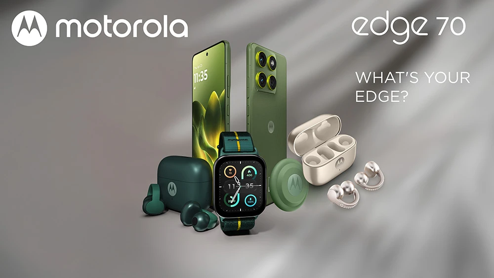 Vánoční balíček Xmass Mega Bundle obsahuje: 1× telefon Motorola EDGE 70 + 1× bezdrátová sluchátka Motorola Moto Buds Loop v provedení Swarovski crystals + 1× bezdrátová sluchátka Motorola Moto Buds Loop v provedení Trekking Green + 1× chytré hodinky Motorola Moto Watch Fit + 1× chytrý přívěsek Moto Tag