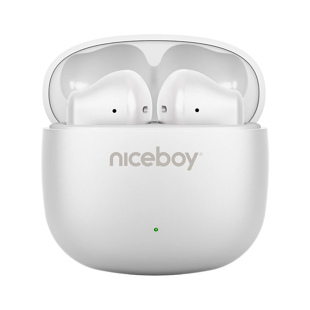 Bezdrátová sluchátka NiceBoy • AAC kodek pro bezztrátový přenos • výdrž sluchátek až 6 h • nabíjecí pouzdro až 20 h • Profily BT: A2DP, AVRCP, HSP, HFP • odolná vodě a potu dle normy IPX4 • aktivace hlasového asistenta Siri nebo Google • kompatibilní s Android i iOS • tři rozměry špuntů • barva: bílá