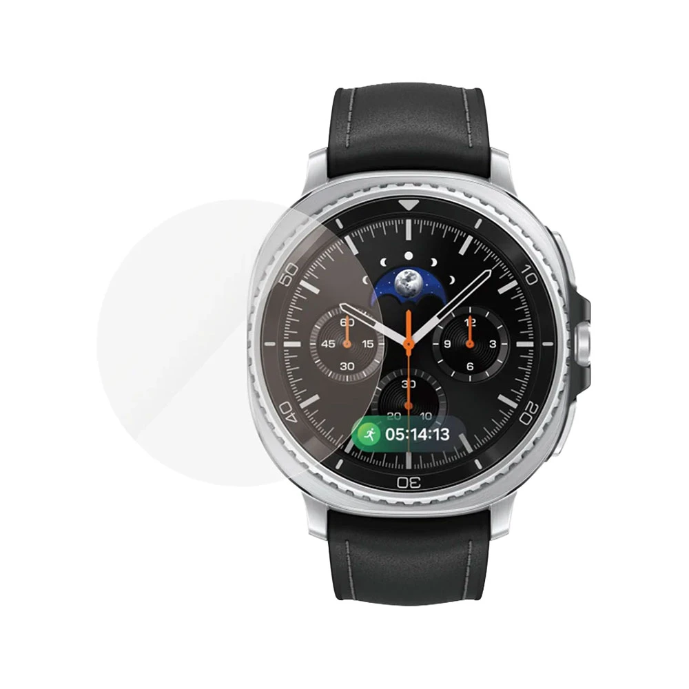 Ochranné tvrzené sklo pro chytré hodinky • vyrobené ze 60 % recyklovaného skla • stoprocentní citlivost dotyku a krystalicky čistý obraz • chrání před pády, nárazy a poškrábáním • odpuzuje mastnotu a otisky prstů • snadná a rychlá instalace bez bublin • absorbuje nárazy • Vyrobeno přesně na míru pro Samsung Galaxy Watch8 Classic 46mm