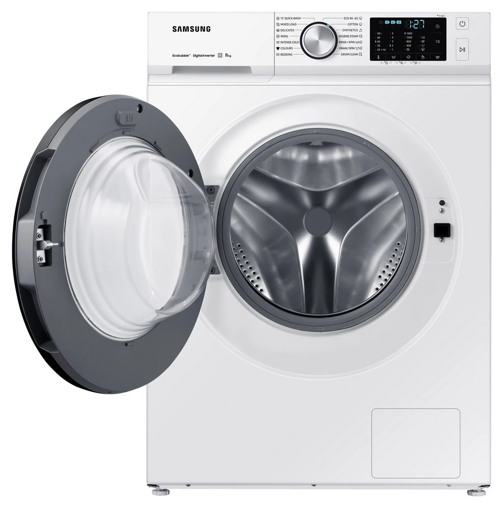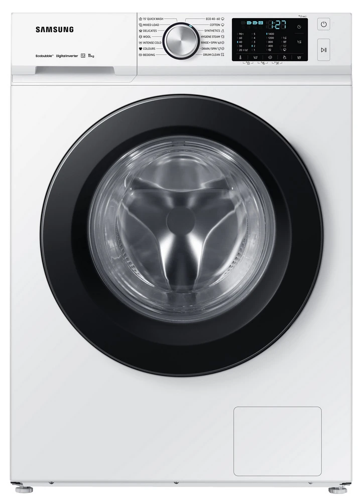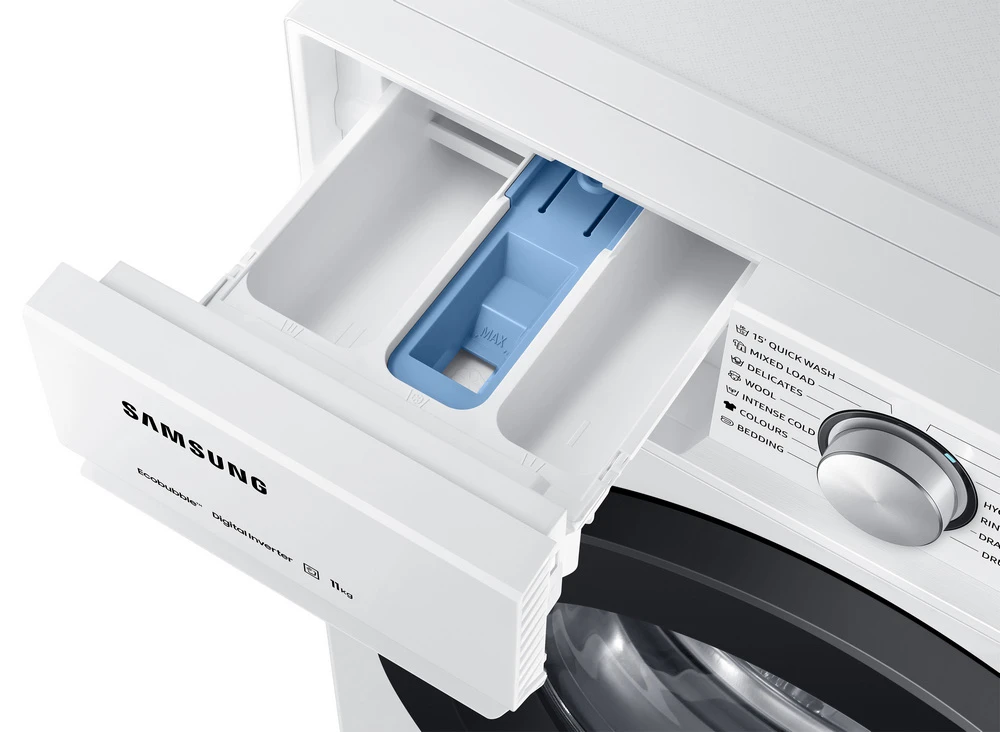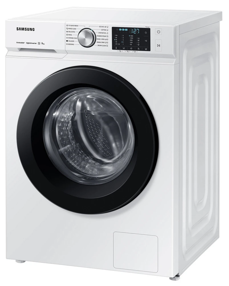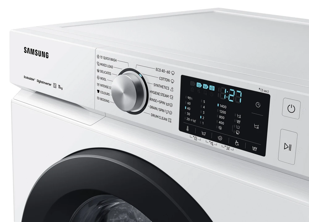 Předem plněná pračka pro 11 kg prádla • 14 programů praní • parní funkce • max. 1 400 ot./min • DIT motor s 20letou zárukou • eliminuje 99,9 % alergenů a bakterií • špičkové funkce Eco Bubble & Bubble Soak • Swirl buben • zásuvka StayClean Drawer • dětská pojistka • odložený start • čištění bubnu • předpírka • rychlé praní • Bespoke SpaceMax design • en. třída: A • barva: bílá