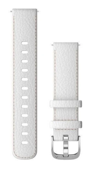 Náhradní bílý kožený řemínek pro hodinky Garmin vívoactive4S.Šířka řemínku 18mm, systém uchycení Quick Release.Kovová přezka ve stříbrné barvě.