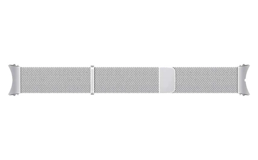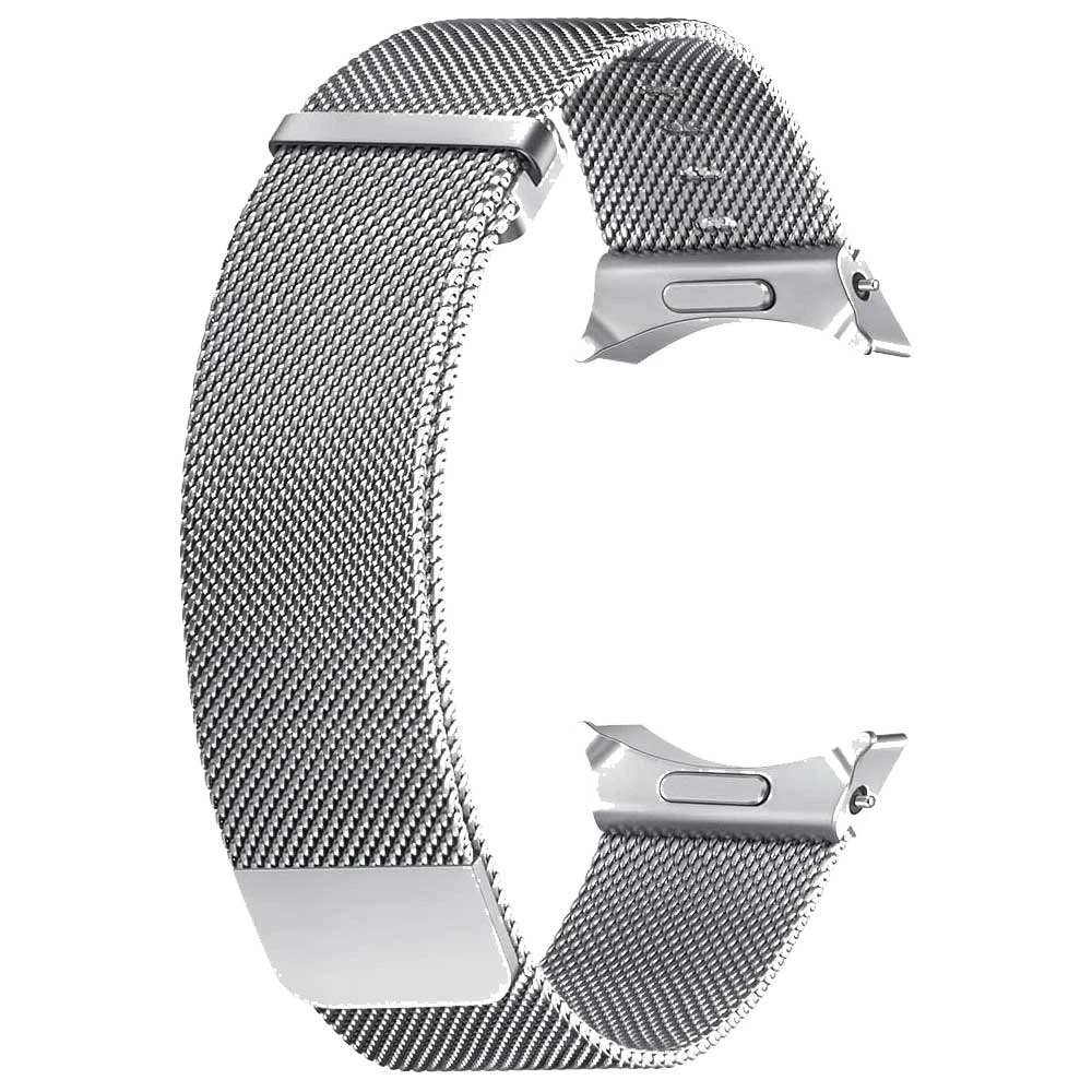 Řemínek pro Samsung Galaxy Watch, materiál prémiová nerezová ocel, s vlastním typem zapojení, pro obvod zápěstí od 16 do 21,6 cm, stříbrná barva, design milánský tah
