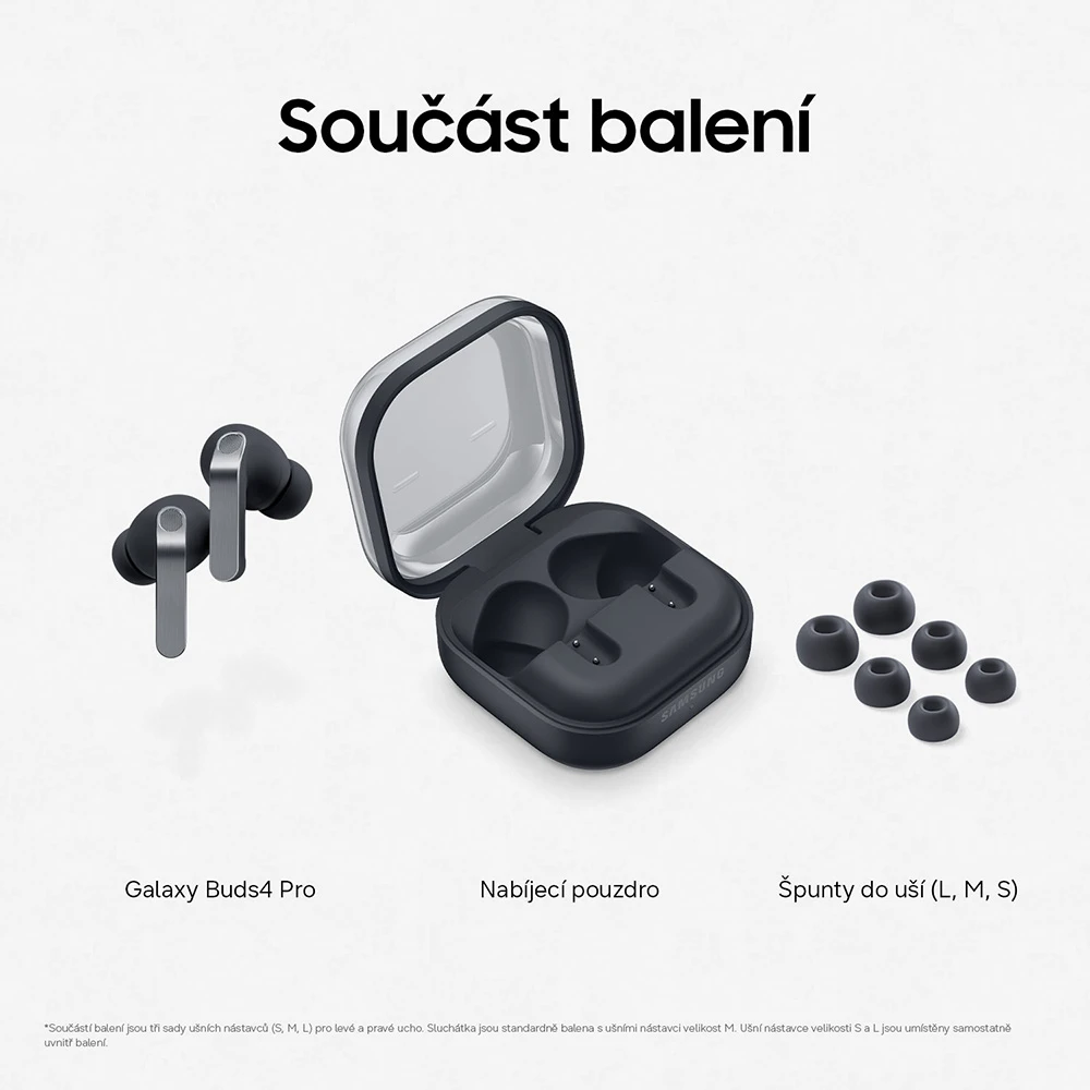 Nabíjecí pouzdro • Sluchátka do uší • Ušní nástavce (S, M, L) • Stručný návod k obsluze