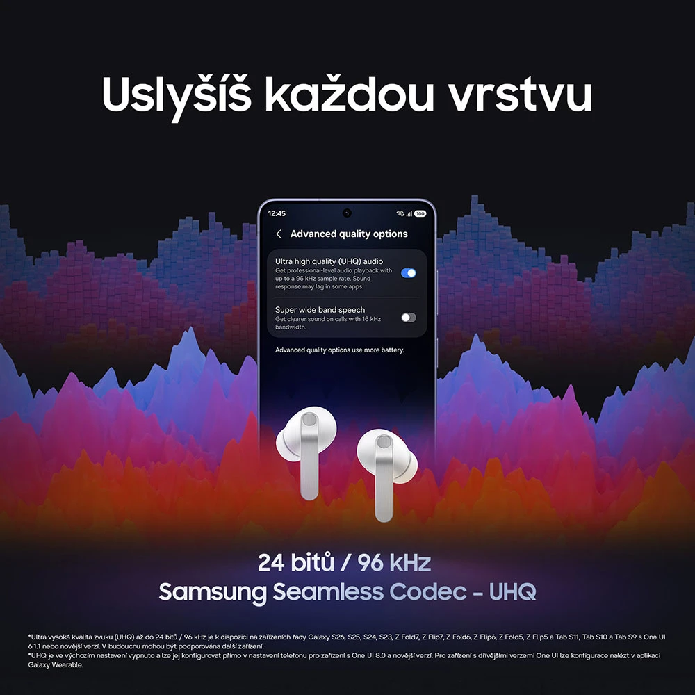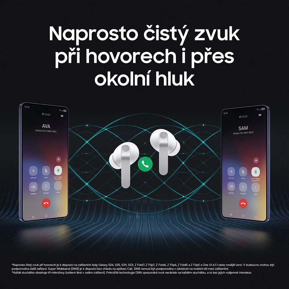 Bezdrátová TWS špuntová sluchátka • 11mm dvoupásmový + 5,4mm výškový reproduktor • 24bit kvalita zvuku • hlasový asistent • trojice mikrofonů • Kodeky: AAC, SBC, SSC, SSC-UHQ • adaptivní ekvalizér • pokročilé funkce Galaxy AI • adaptivní potlačení okolního hluku • Adaptivní regulace hluku • režim Ambient • Ovládání přitlačením, dotykem a přejetím • fce 360 audio • odolnost IP54 • BT 6.1 • Výdrž až 7h sluch. + 23h pouzdro (bez ANC) • aplikace Samsung Health • USB-C a bezdr. nabíjení • barva: bílá