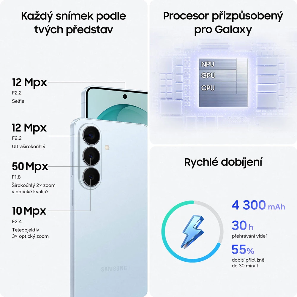 U nejvyšší neskládací řady Samsungu se samozřejmě dočkáte špičkové hardwarové výbavy. Mozkem Galaxy S26 je vynikající procesor vlastní výroby: Samsung Exynos 2600. Výkonné je CPU (výpočetní jednotka), GPU (grafický procesor) i NPU (neurální procesor využívaný při práci s AI), takže si smartphone hravě poradí i s těmi nejnáročnějšími úkoly. Tato varianta S26 přichází s pěknými 12 GB RAM a 256GB úložištěm. 4300mAh baterie zajišťuje dlouhou výdrž, mj. díky energeticky úspornému čipsetu. Telefon podporuje 25W nabíjení, takže při použití správně výkonné nabíječky se dostane na cca 55 % kapacity již za 30 minut. Zmínku si zaslouží ještě nejmodernější konektivita, jmenovitě podpora Wi-Fi 7 a rychlých mobilních sítí 5G.