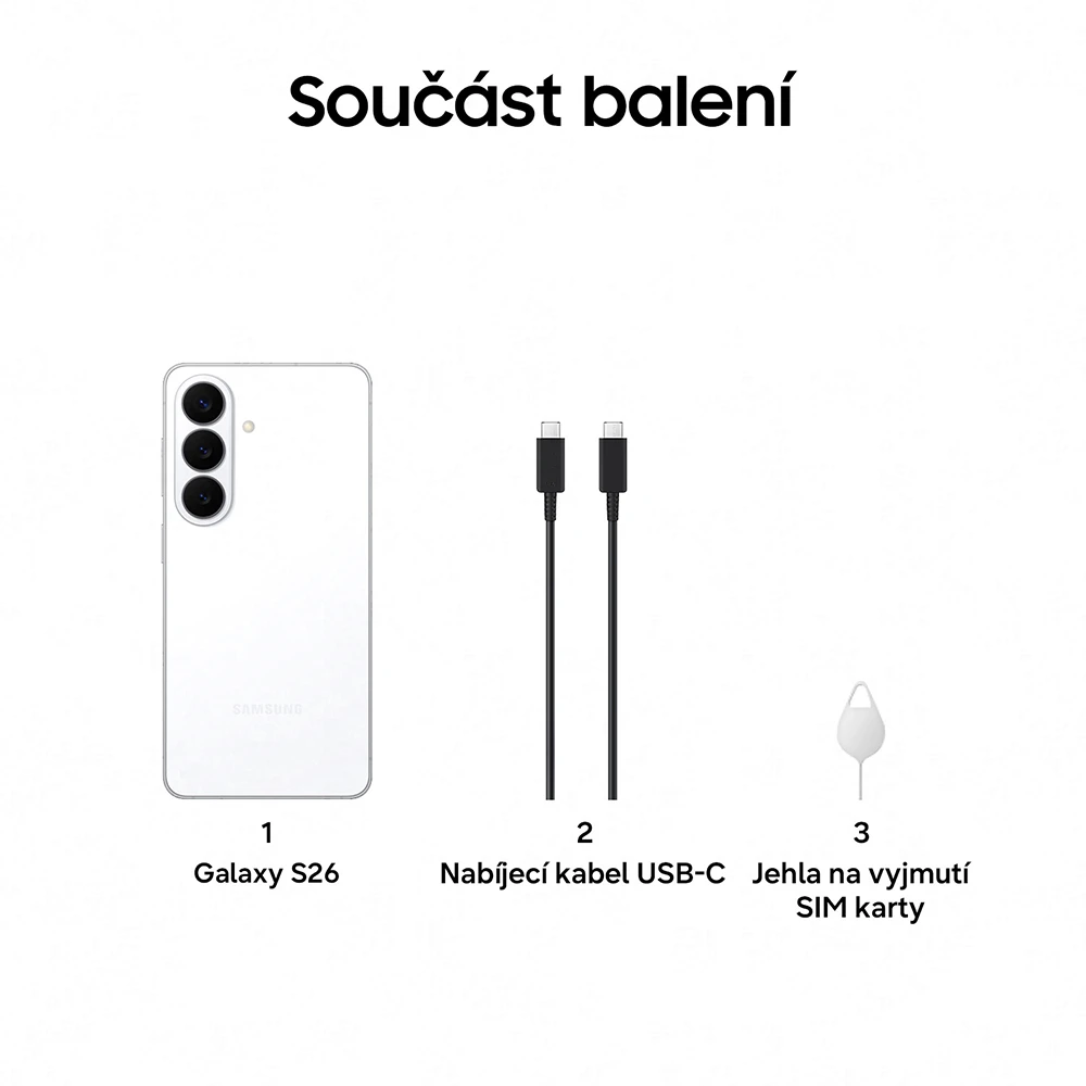Mobilní telefon s 6,3" Full HD+ Dynamic LTPO AMOLED 2X displejem o rozlišení 2 340 × 1 080 px (1-120 Hz, HDR10+, až 2 600 nitů) • 10jádrový proc. Exynos 2600 • 12GB RAM • 512GB vnitřní úložiště • trojice zadních fotoaparátů - 50MPx (f/1,8) + 12MPx (f/2,2) + 10MPx (f/2,4) • OIS • přední 12MPx kamera (f/2,2) • stereo reprod. • ultrazvuk. čt. otisků • 5G • Wi-Fi 7 • BT 5.4 • NFC • GPS • USB-C 3.2 • IP68 • 4 300mAh bat. s 25W drát. a 15W bezdr. nab Qi2 • Android 16 • Sams. DeX • barva: bílá