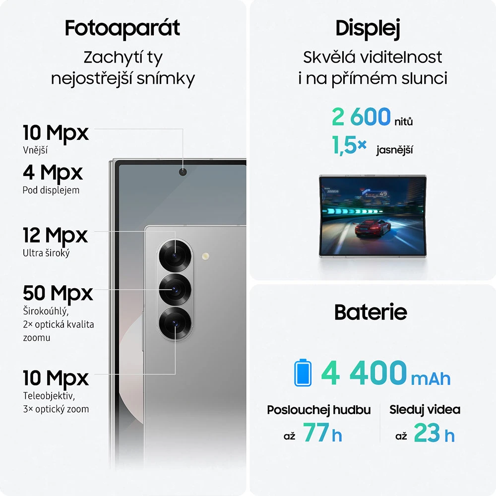 Smartphone s ohebným 7,6" Quad HD+ Dynamic AMOLED 2X displejem (2160×1856 px,1-120 Hz) • vnější 6,3" AMOLED displej (2376×968 px,1-120 Hz) • Snapdragon 8 Gen 3 • 12GB RAM • 256GB ROM • zadní foto. 50 MPx (f/1,8) + 12MPx (f/2,2) + 10MPx (f/2,4) • OIS • přední foto. 4MPx (f/1,8) + 10MPx (f/2,2) • stereo repro. • Dolby Atmos • boční čt. otisků •podp. S Pen • Wi-Fi • 5G • Bluetooth 5.3 • NFC • UWB • USB-C • Samsung DeX • 4400mAh bat. s rychlým i bezdrát. nab. • Android 14 • IP48 • barva: šedá