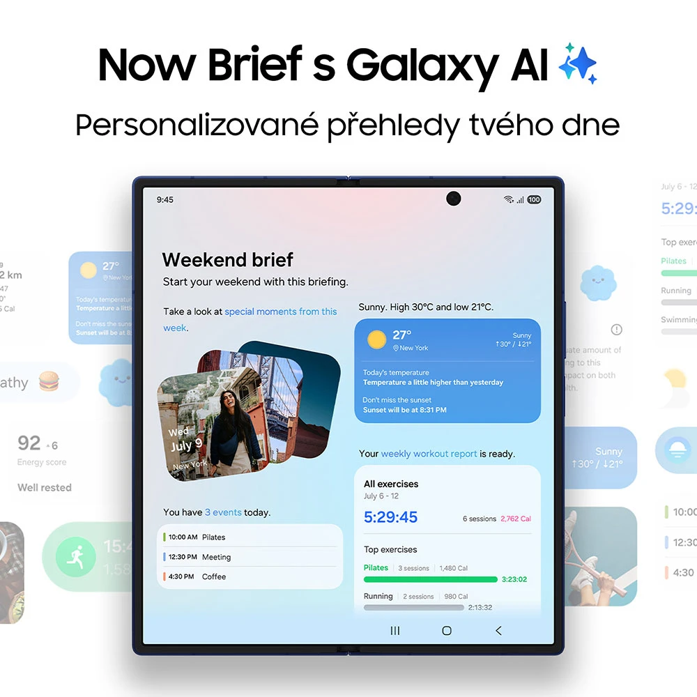 Z Fold7 vstupuje na trh se zbrusu novým One UI 8, jež je založené na Androidu 16. Těšit se ale můžete na 7 let oficiální softwarové podpory a 7 nových verzí OS. Systém nadchne ultrapokročilou umělou inteligencí, která umí chytře pracovat s informacemi v různém kontextu a je ještě lépe optimalizovaná tak, aby naplno využila obrovskou vnitřní obrazovku. Sdílejte s Gemini Live obsah displeje a zadávejte mu pokyny jednoduše hlasem. Samozřejmě zůstávají také oblíbené funkce, jako je Vyhledávání zakroužkováním, kdy přes Google snadno vyhledáte cokoli, co právě vidíte na displeji. Zvláštní zmínku si zaslouží pokročilé (mj. generativní) úpravy fotografií a chytré možnosti editace videa, jako je odfiltrování rušivých frekvencí zvuku.