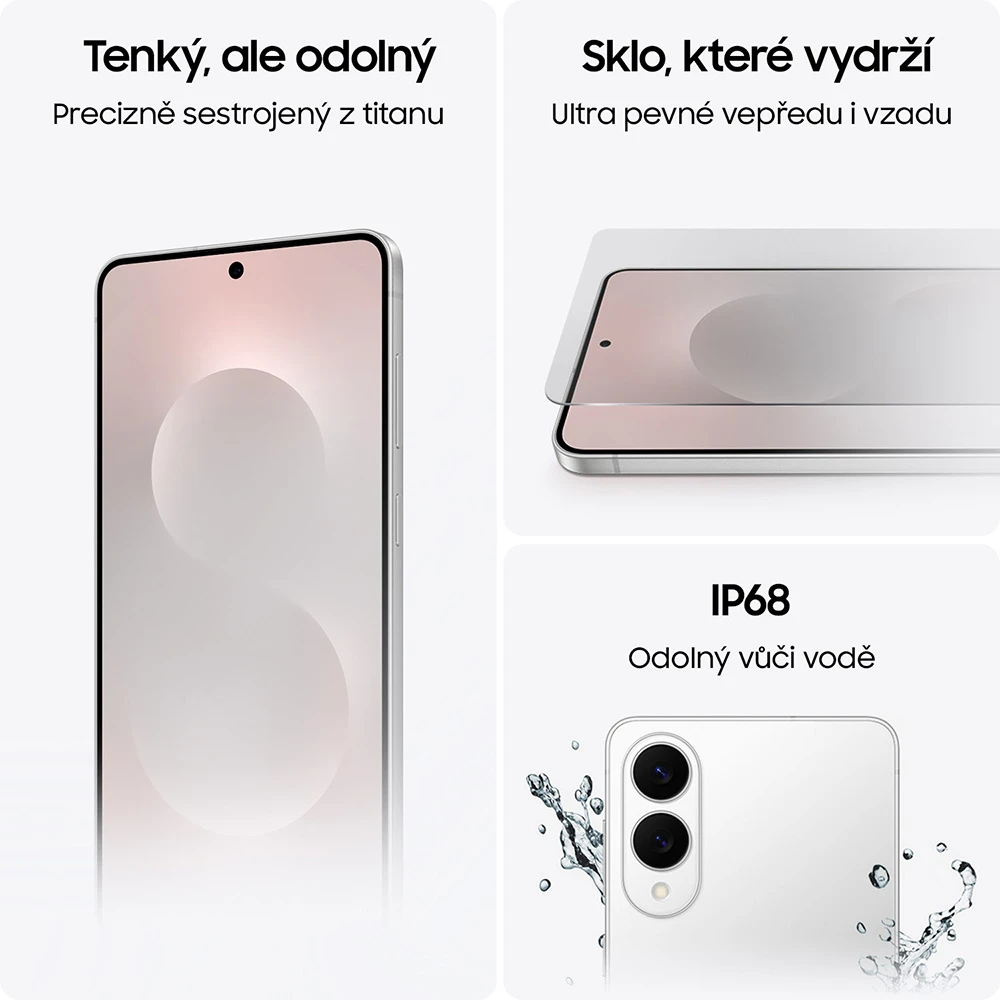 Mobilní telefon s 6,7" Dynamic LTPO AMOLED 2X displejem o rozlišení 3 120 × 1 440 px (1-120 Hz, HDR10+, až 2600 nitů) • 8jádrový proc. Snapdragon 8 Elite for Galaxy • 12GB RAM • 256GB vnitřní úložiště • trojice zadních fotoaparátů - 200MPx hlavní (f/1,7) + 12MPx ultraširoký (f/2,2) • OIS • přední 12MPx kamera (f/2,2) • stereo reprod. • ultrazvuk. čt. otisků • 5G • Wi-Fi 7 • BT 5.4 • NFC • GPS • IP68 • 3900mAh bat. s 25W drát. a 15W bezdr. nab. • Android 15