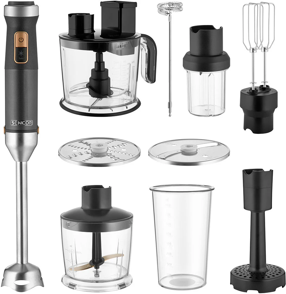 - Bohaté příslušenství v balení – food processor 1,5 l, sekáček 500 ml, šlehače, mačkač brambor, mlýnek, napěňovač mléka