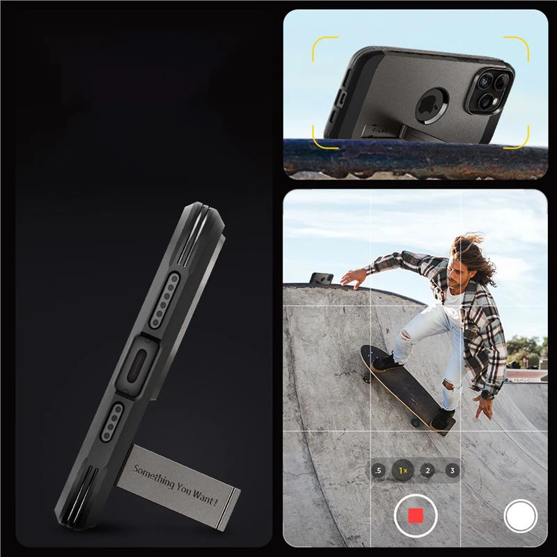 Ochranný kryt Spigen Tough Armor MagSafe pro iPhone 15 Pro Max • zabudovaný magnetický kruh pro funkci s MagSafe • extrémní dvouvrstvá ochrana • mírně zvýšené okraje krytu pro lepší ochranu • Mil-grade certifikace odolnosti při pádu s Air Cushion Technology v rozích krytu • přesné výřezy nabízí plný přístup k fotoaparátu, senzorům a dalším funkcím zařízení • výklopný stojánek na zadní straně • kompatibilní s bezdrátovým nabíjením a MagSafe • materiál: TPU + PC