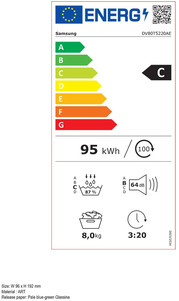 Sušička Samsung DV80T5220AE/S7 se s vytříbenou šetrností postará o každičký kousek vašeho oblečení – prostřednictvím sofistikovaného systému OptimalDry a 3 inteligentních senzorů sleduje v reálném čase vlhkost prádla a na základě toho upravuje čas nutný k sušení. Aby byly oděvy přichystány rychle, avšak za použití co nejnižšího množství energie. A doslova revoluční je i ovládání – řešení AI Control si ve spolupráci s nesmírně intuitivním displejem pamatuje vaše rutiny a návyky, navrhuje cenné tipy a představuje praktické informace, jež vám zpříjemní každodenní ovládání. Aby se ze sušení prádla stala radost, nikoliv pouze nutnost.