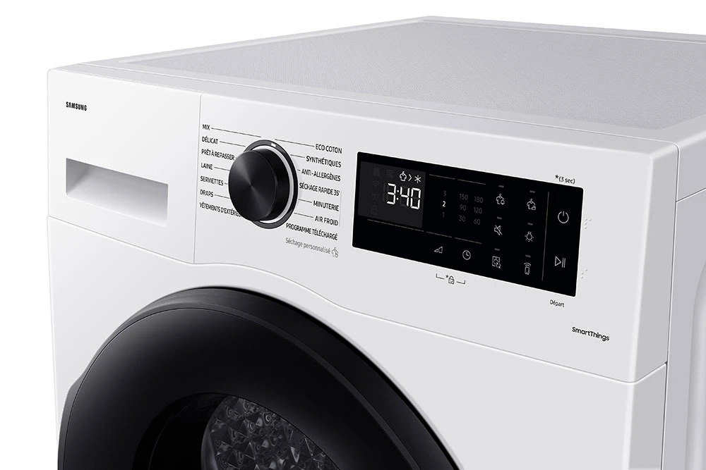Sušička prádla 9 kg • energetická třída C • AI Energy Režim • 20 let záruka na motor • Wi-Fi • SmartThings • 14 programů • Wrinkle Prevent – ochrana proti pomačkání • technologie OptimalDry – pro optimalizaci doby sušení • Quick Dry – sušení za 35 min. • osvětlení bubnu • LED displej • V × Š × H: 85 × 60 × 60 cm (hloubka s přesahem: 65 cm)
