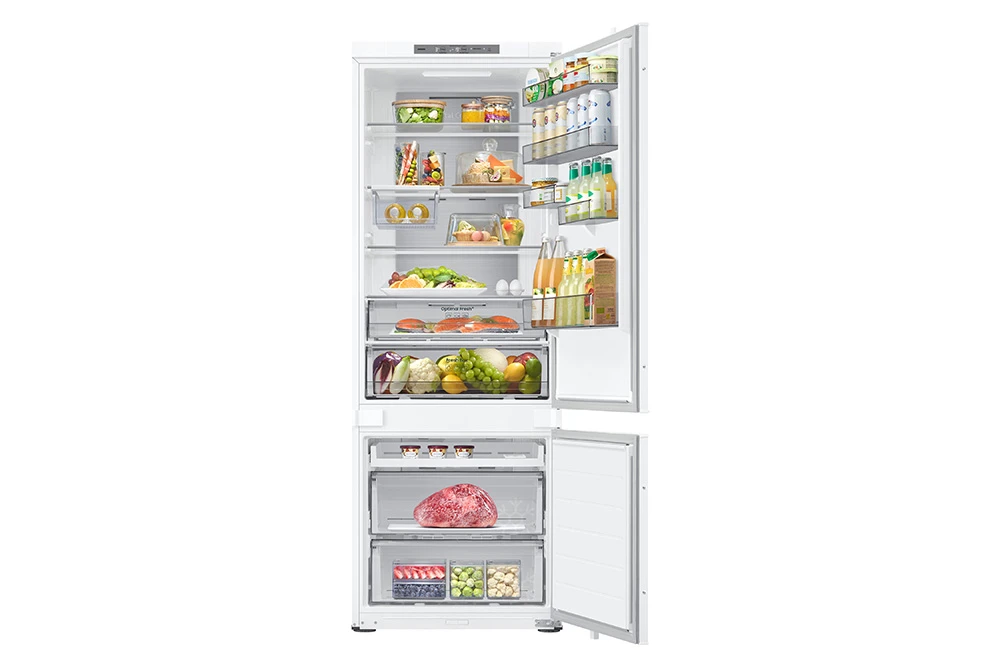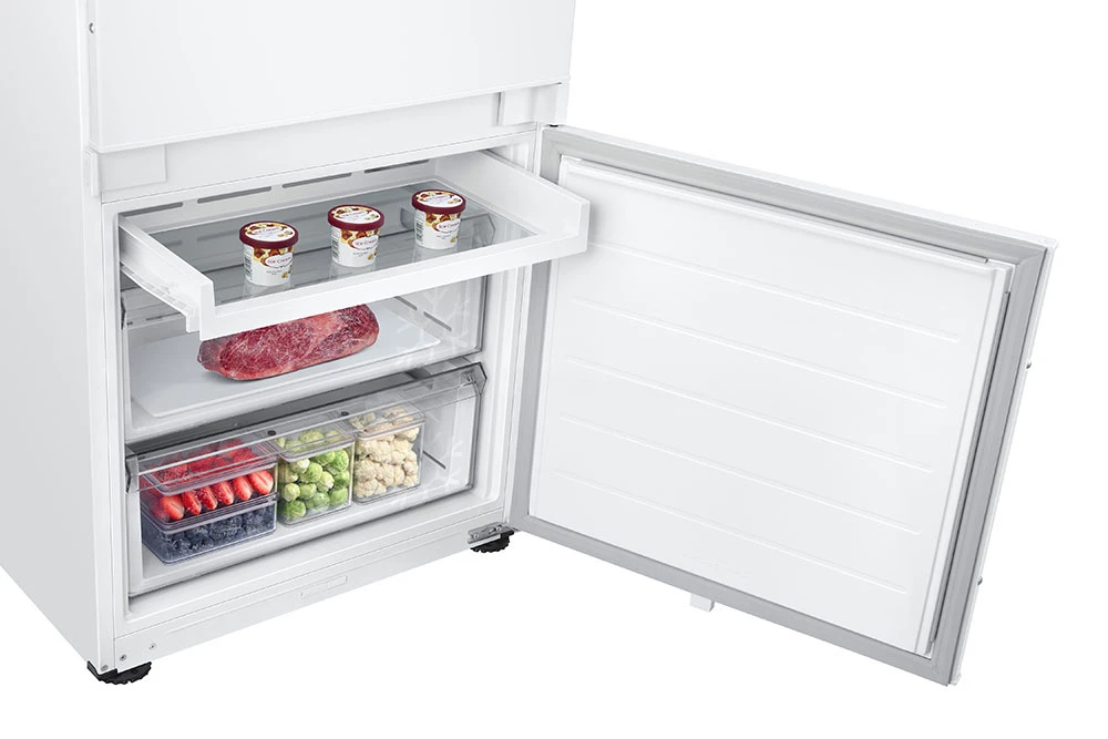 Kombinovaná chladnička Samsung BRB38G705DWWEF zaujme velkým celkovým objemem 389 litrů, za který vděčí mimo jiné chytrému řešení SpaceMax. Díky inovativní, účinné izolaci může mít tenčí stěny, takže zvenčí je standardně velká, ale uvnitř prostornější. Pomáhají také nevystupující průduchy Flat Metal Duct. Své jídlo si můžete přehledně uspořádat, protože interiér je velmi prakticky řešený. Využijte například víceúčelovou zásuvku MultiTray, jež se vkládá pod poličky a pojme i drobnější potraviny. Z užitečné výbavy zaslouží zmínku ještě šetrné osvětlení Gentle Lighting, které se umí mj. postupně rozsvěcet a nabízí méně intenzivní noční režim. Protože je lednice vestavná, zapadne dokonale mezi ostatní skříňky ve vaší kuchyňské lince.