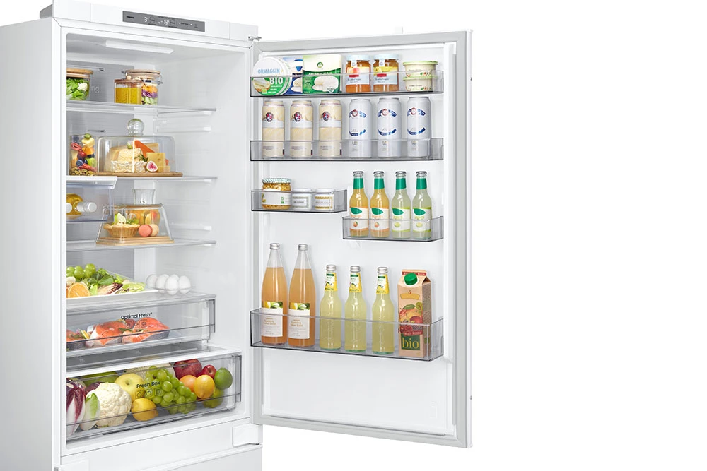 Kombinovaná chladnička Samsung BRB38G705EWWEF zaujme velkým celkovým objemem 389 litrů, za který vděčí mimo jiné chytrému řešení SpaceMax. Díky inovativní, účinné izolaci může mít tenčí stěny, takže zvenčí je standardně velká, ale uvnitř prostornější. Pomáhají také nevystupující průduchy Flat Metal Duct. Své jídlo si můžete přehledně uspořádat, protože interiér je velmi prakticky řešený. Využijte například víceúčelovou zásuvku MultiTray, jež se vkládá pod poličky a pojme i drobnější potraviny. Z užitečné výbavy zaslouží zmínku ještě šetrné osvětlení Gentle Lighting, které se umí mj. postupně rozsvěcet a nabízí méně intenzivní noční režim. Protože je lednice vestavná, zapadne dokonale mezi ostatní skříňky ve vaší kuchyňské lince.