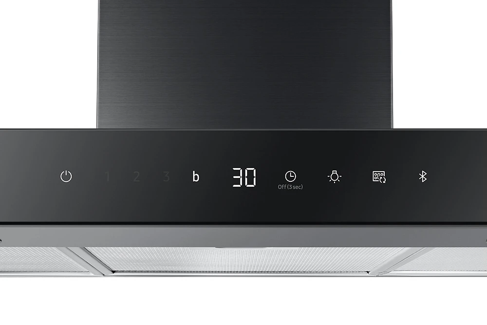 Pokud si pořídíte kompatibilní varnou desku Samsung, můžete získat přístup k unikátní funkci. Oba spotřebiče se umějí propojit přes Bluetooth, takže se dá digestoř ovládat přímo přes ovladače na desce. (Tato funkce je dostupná pouze v kombinaci s vybranými varnými deskami Samsung.)