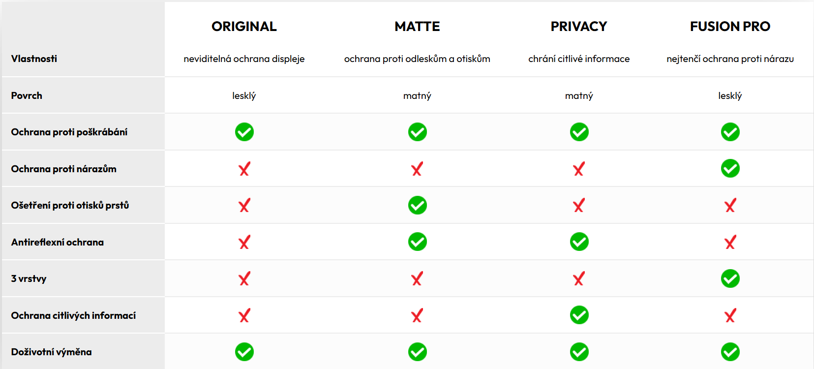 Základ je fólie Original, která zajistí ochranu křehkého displeje se zachováním vysokého rozlišení a skvělého obrazu. Pro špičkovou ochranu proti nárazům je tu nová generace fólií Fusion Pro – až 3× pevnější než tvrzené sklo a se třemi vrstvami pro maximální odolnost. Fólie Matte je matná ochranná fólie s antireflexní vrstvou zabraňující odrážení přímého světla. Poslední variantou je fólie Privacy, jejíž dvousměrný filtr znemožňuje čitelnost displeje smartphonu při pohledu zboku.